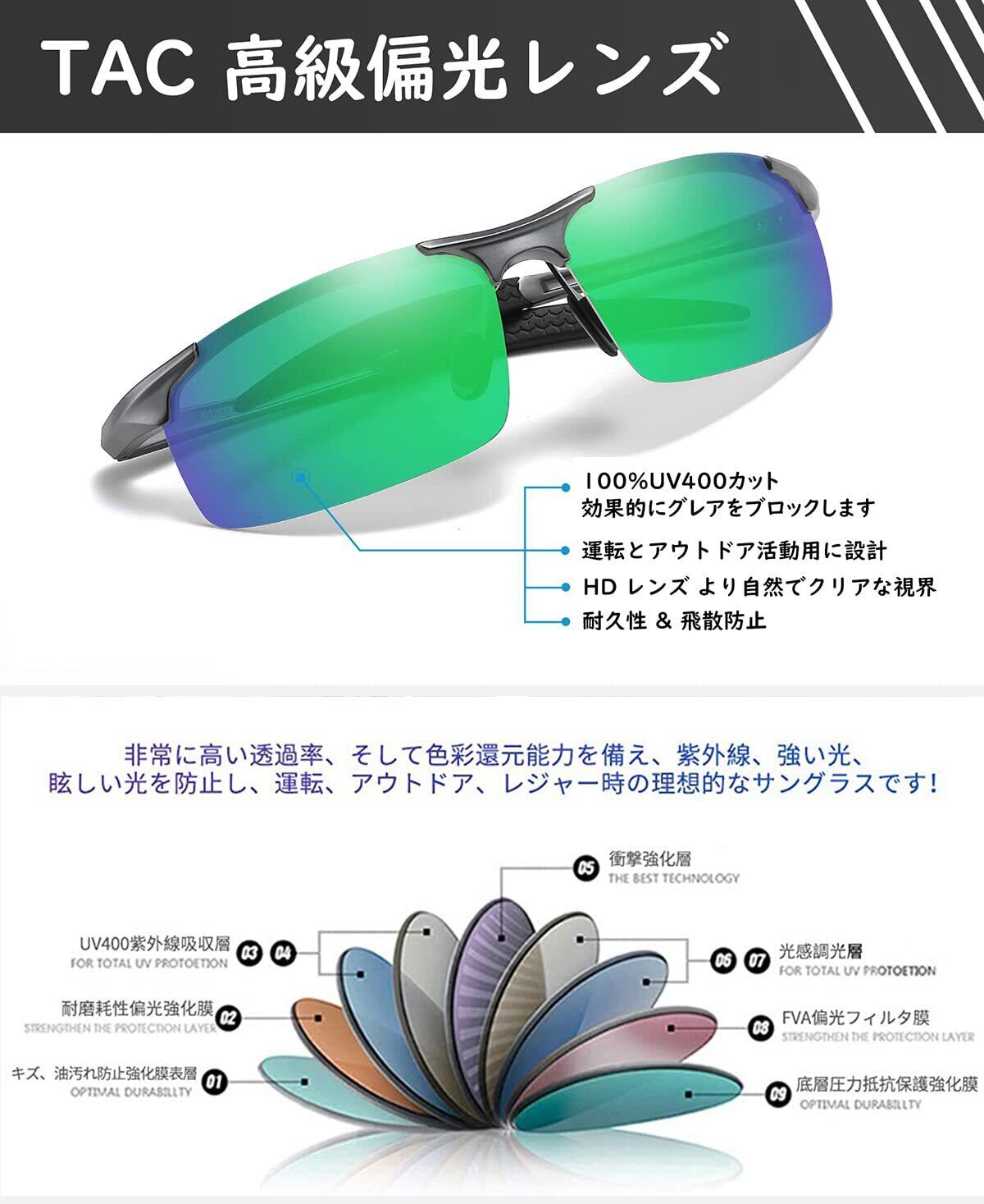 【TAC 偏光 レンズ】:UV400保護コーティングは、有害なUVA&UVB光線を100%塞ぎます。視覚的に、真実の色を復元し、または反射した、散乱したライトを取り除きます。TAC偏光トリアセテートレンズは、耐衝撃性、スクラッチ抵抗性、軽量性、耐久性に優れています!