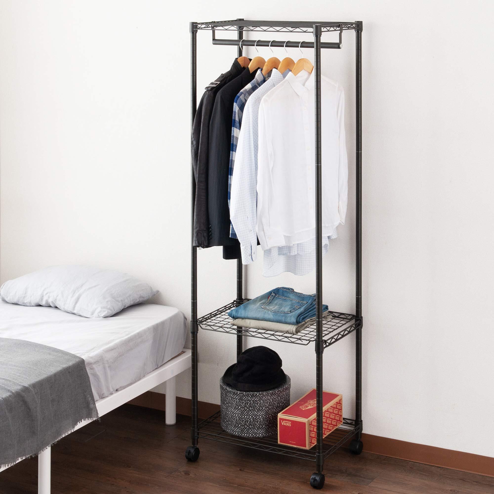 ハンガーポールを使用することで、棚収納がワードローブに。ラックを使用したオールインワン収納を作りたい方必見。