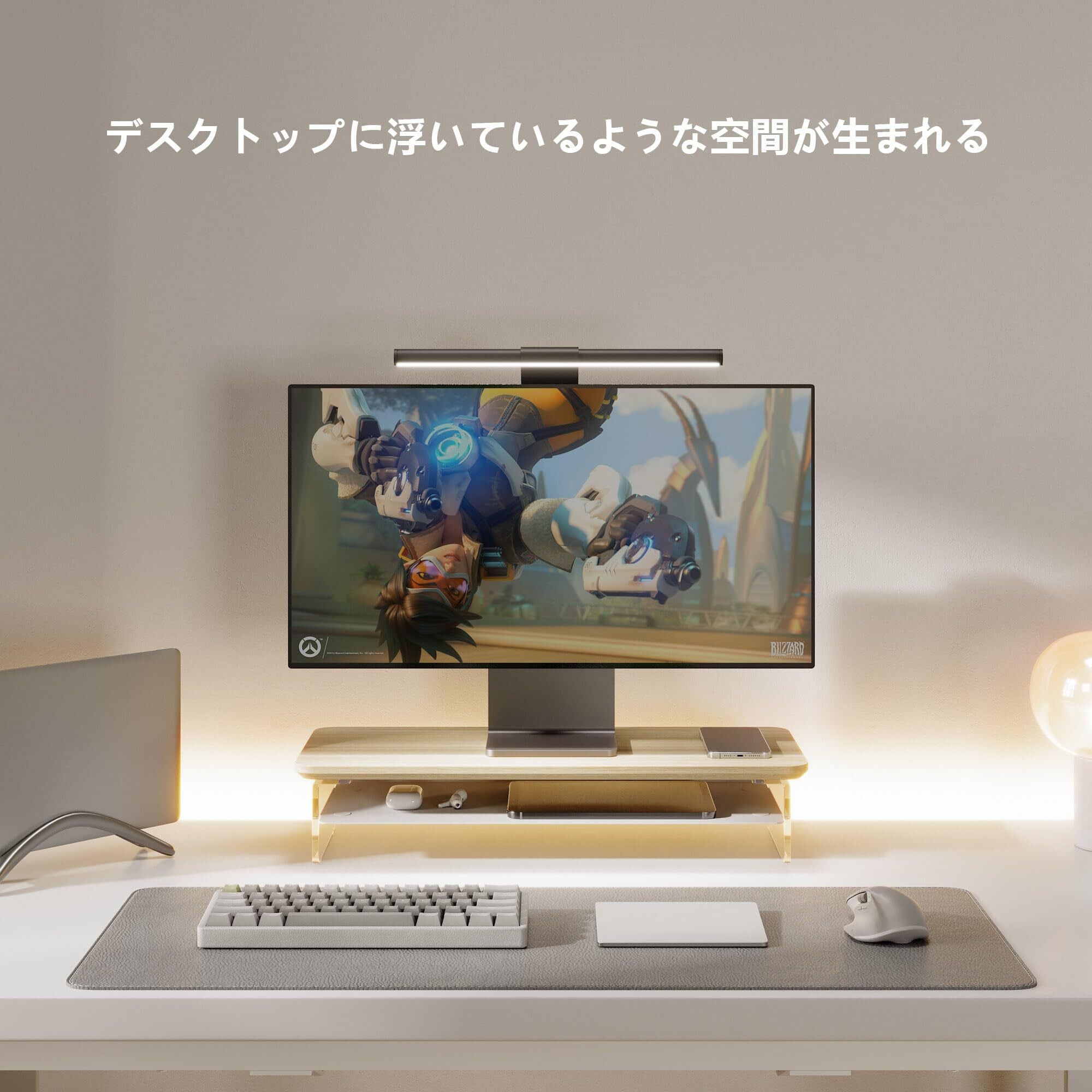 【アクリルの脚・浮いている空間】モニタースタンドの脚は、透明なアクリル板を採用しており、解放感があります。さらに、デスクトップに浮いているような感覚を与えます。特に夜にはLEDライトと組み合わせると、爽やかな昼間とは一変、神秘的な雰囲気を作り出します。