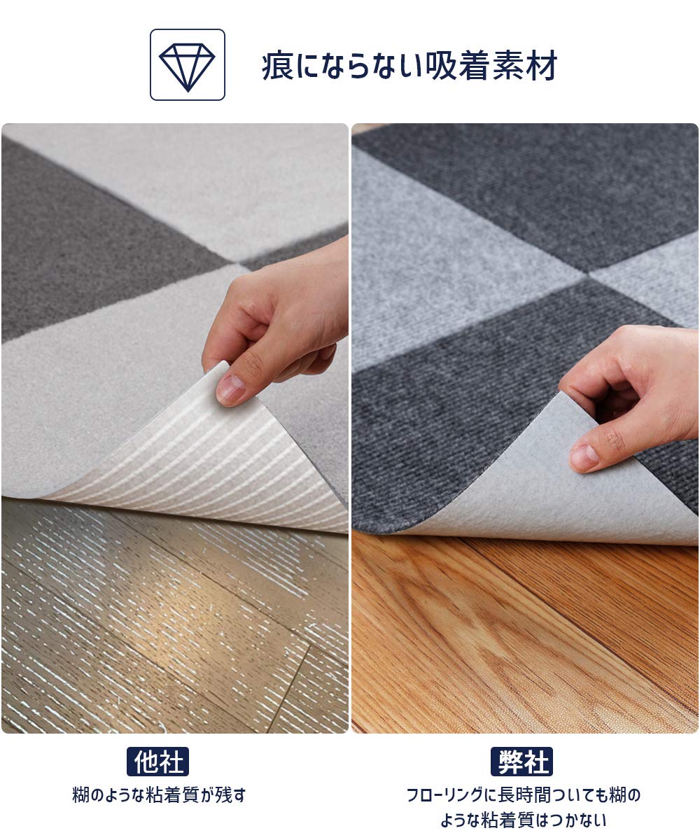 【ずれない 吸着タイルカーペット】空気が抜け真空状態になって無数の吸盤ができたようなくっつく仕組みだから、動き回ってもマットはズレません。厚み約4mmのマットですので、つまずきにくく、扉の開閉の妨げにもなりません。引っ掛かったりする恐れが少なくなる。高齢者や老犬は足腰が弱くなり、滑り止め対策として良いものです。