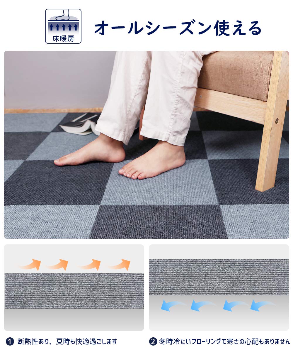 【適応性が広い】カーペットを敷いた床は保温性あり、防音性、遮音性に優れ、ホコリも舞上がりにくくて、ずれないという特性があります。■使用場所が多い:①玄関周り(自転車や椅子などの床キズ.汚れ防止に便利。) ②廊下(老犬や高齢者は足腰が弱くなり、滑り止め対策として) ③キッチン(ガラスや陶器の食器を落とした場合には、衝撃を吸収してくれるので割れにくい) ④室内(落下音や椅子を引く時の衝撃音を吸収軽減するため、防音対策に最適)など。