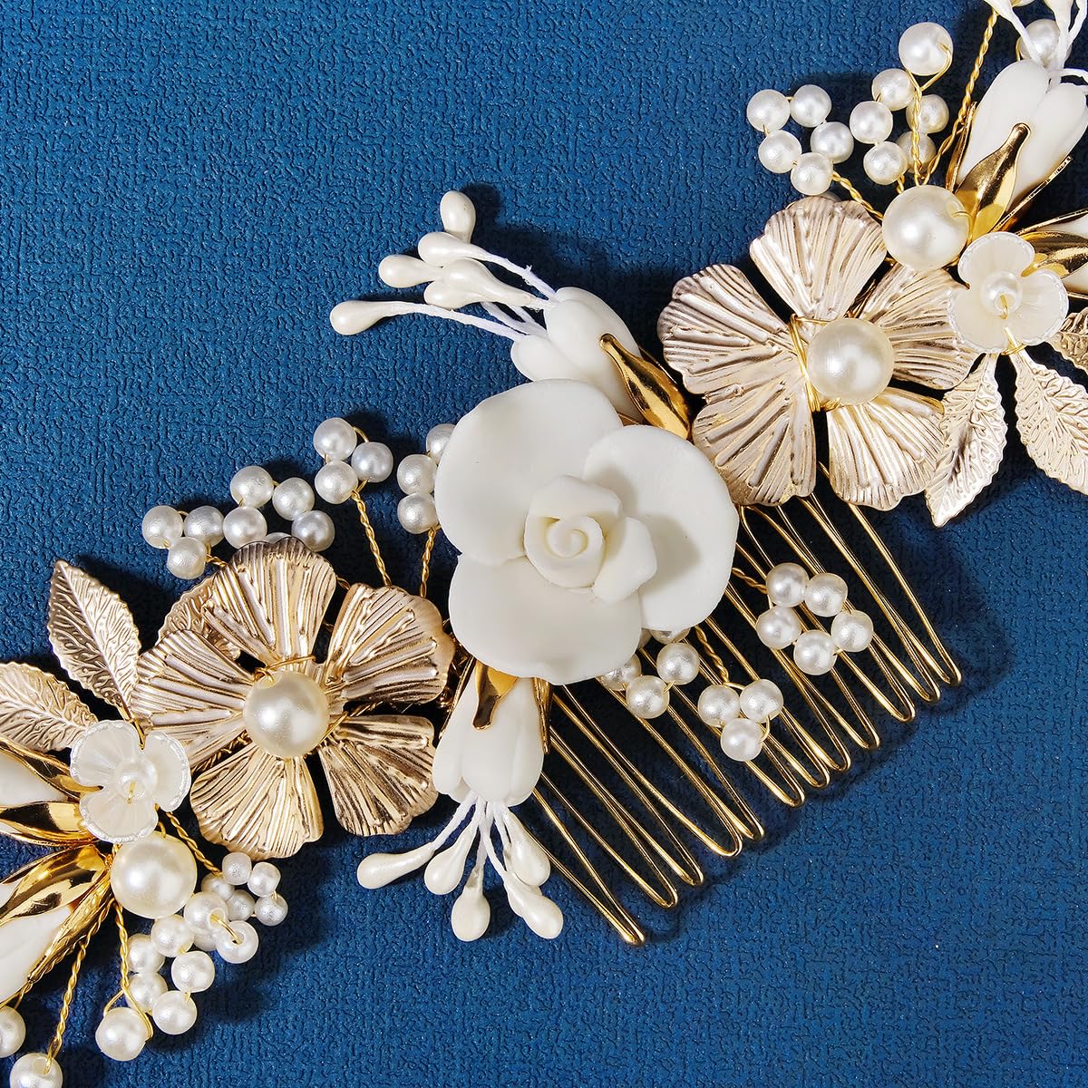 ヘッドドレス 髪飾り ヘアアクセサリー バレッタ ヘアバレッタ 手作り 模造パール フラワー コーム Uピン ヘアピン ヘア飾り 花嫁 結婚式 ウェディング 成人式 披露宴 パーティー 卒業式 入学式 和装 結婚式贈り物として適しています… (白い花と金の花)