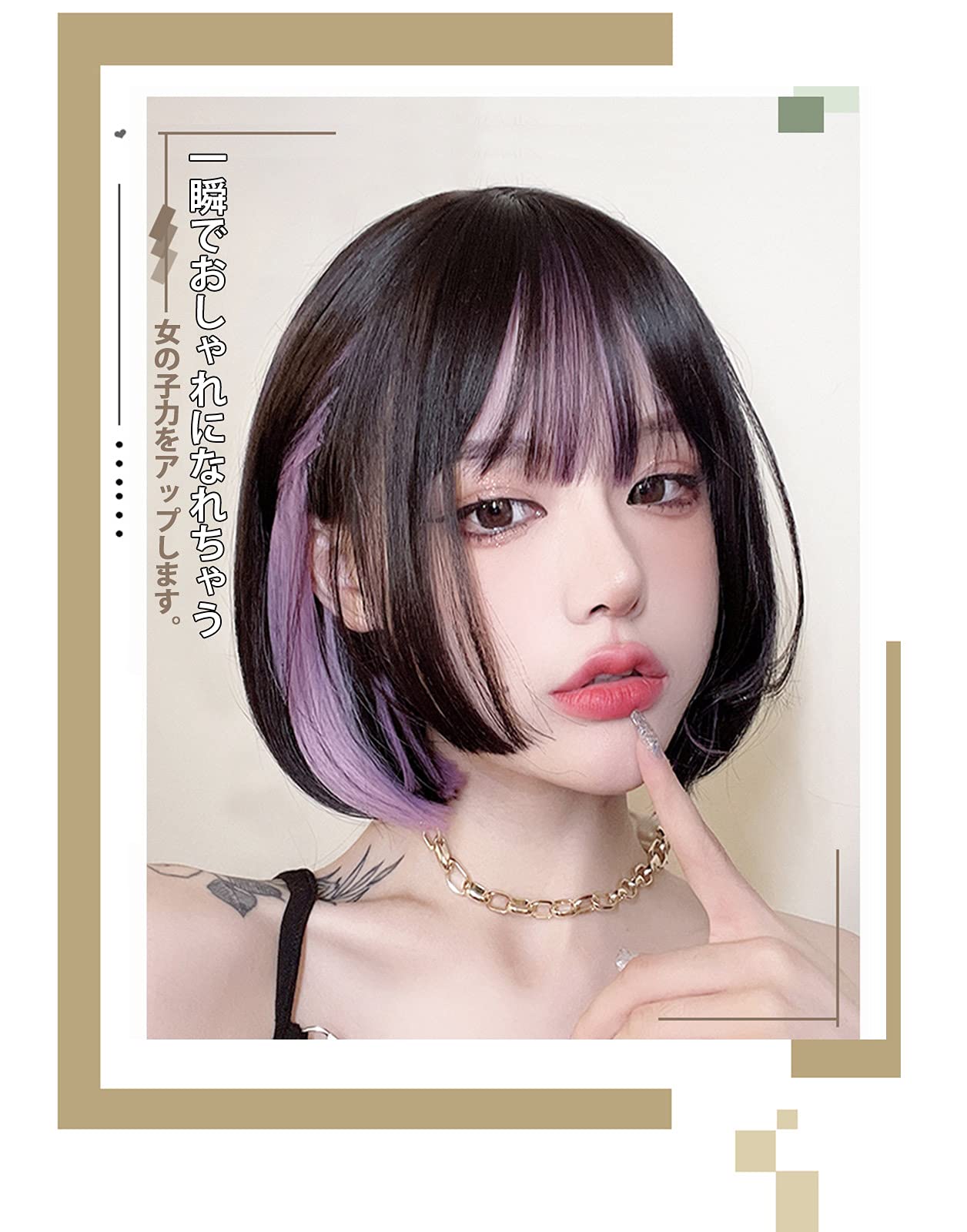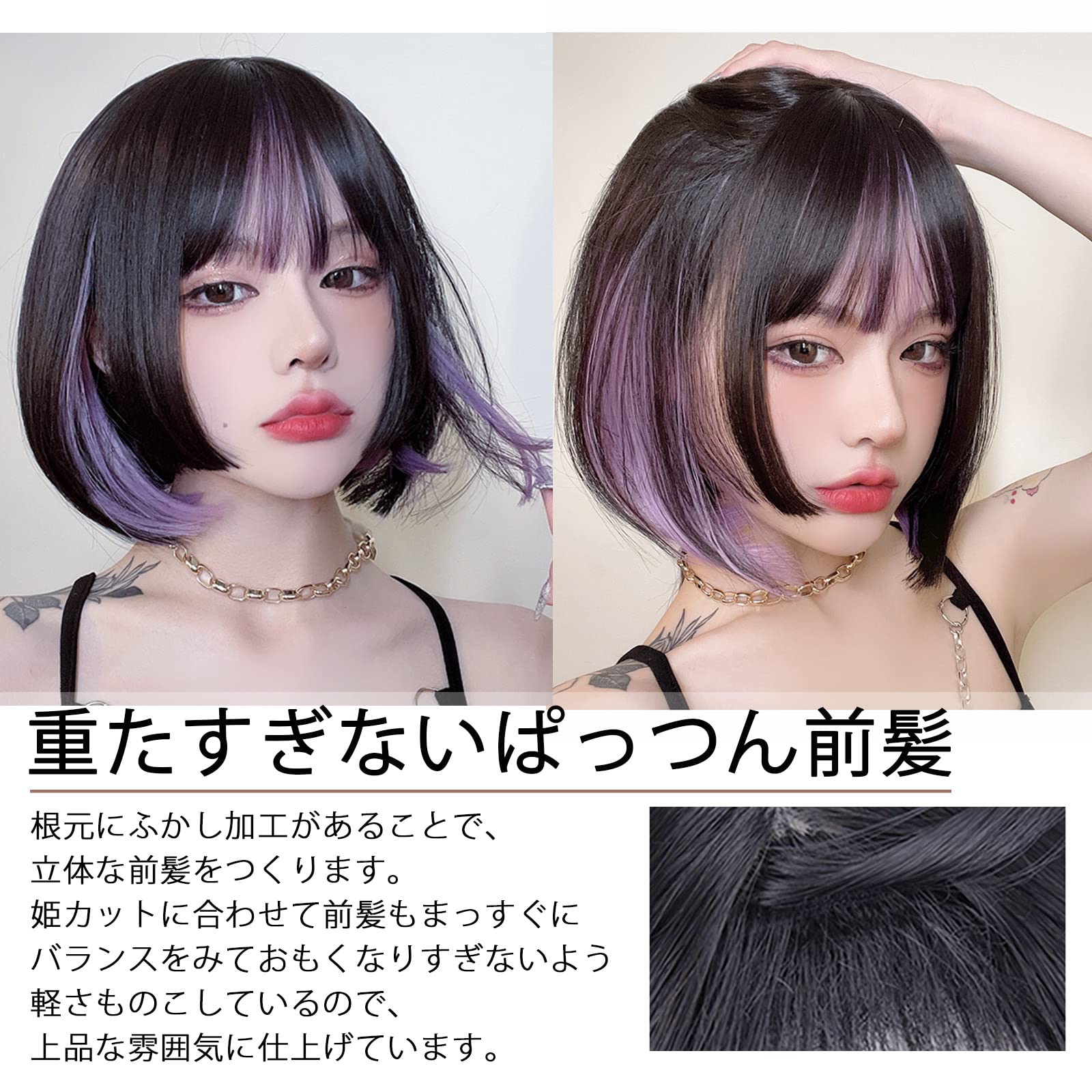 ①自然なつむじ肌色の人工スキンで、自然なつむじを再現!I型なので近く見ても本物のようなつむじです。インナーカラーが抜け感アップ、耳にかけても可愛い、サイドの毛を耳にかけると、インナーカラーがチラリと見えるので、可愛さと個性をさりげなく印象づけます。②ふんわり張り付かない前髪のふかし加工、前髪の根元に短い毛をいれた「ふかし加工」で、額に張り付かずふんわり!雰囲気を変えてくれるショートボブ、顔周りを重ためにすることで、可愛いだけではなく小顔効果も演出します