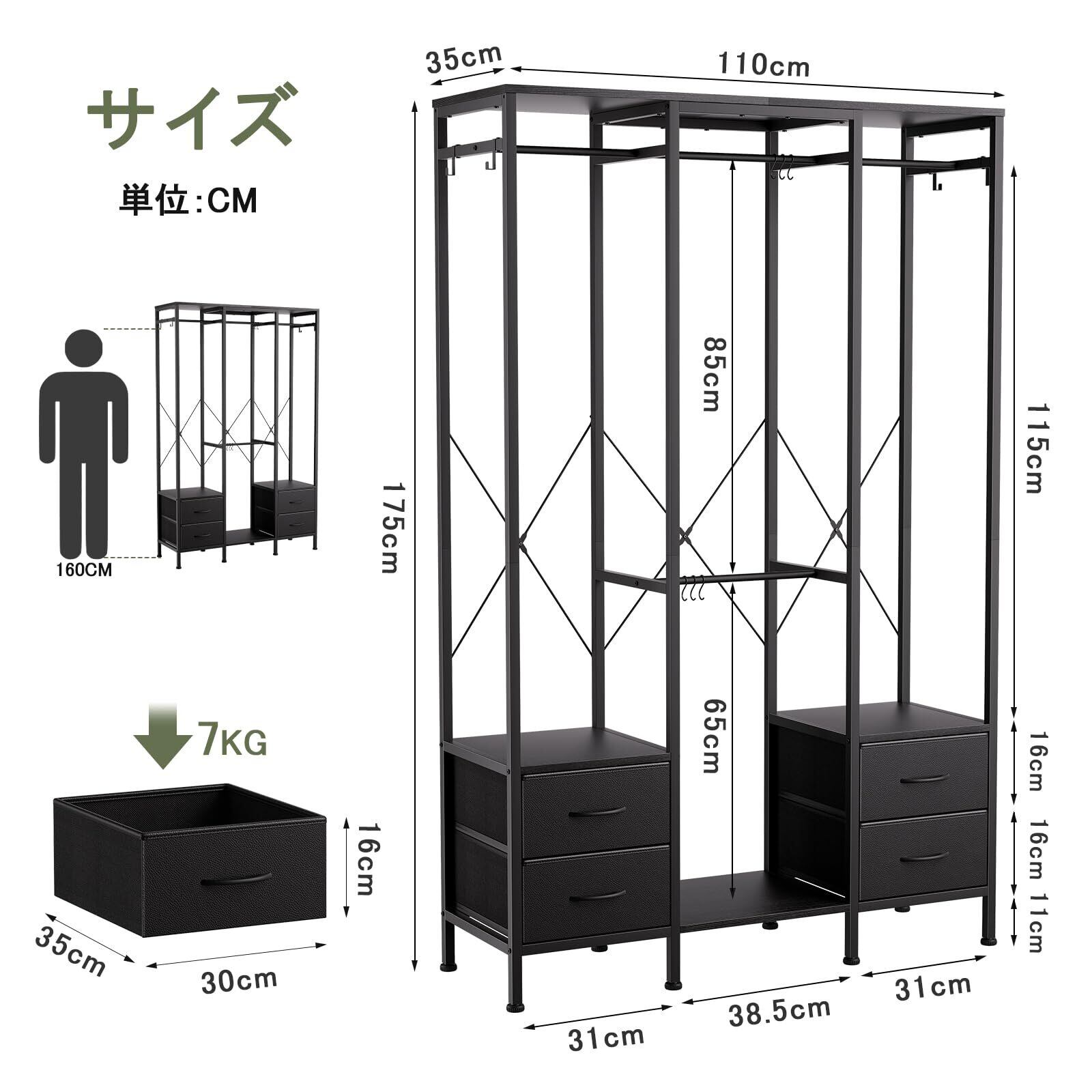 ハンガーラック 引き出し付き ワードローブ 頑丈 洋服ラック 大容量 収納付き 洋服収納 クローゼット 収納ラック 洋服掛け 衣装棚 押し入れ 棚付き 防サビ加工 組み立て簡単 衣類収納 全体耐荷重180kg(高防水性皮革 ブラック)