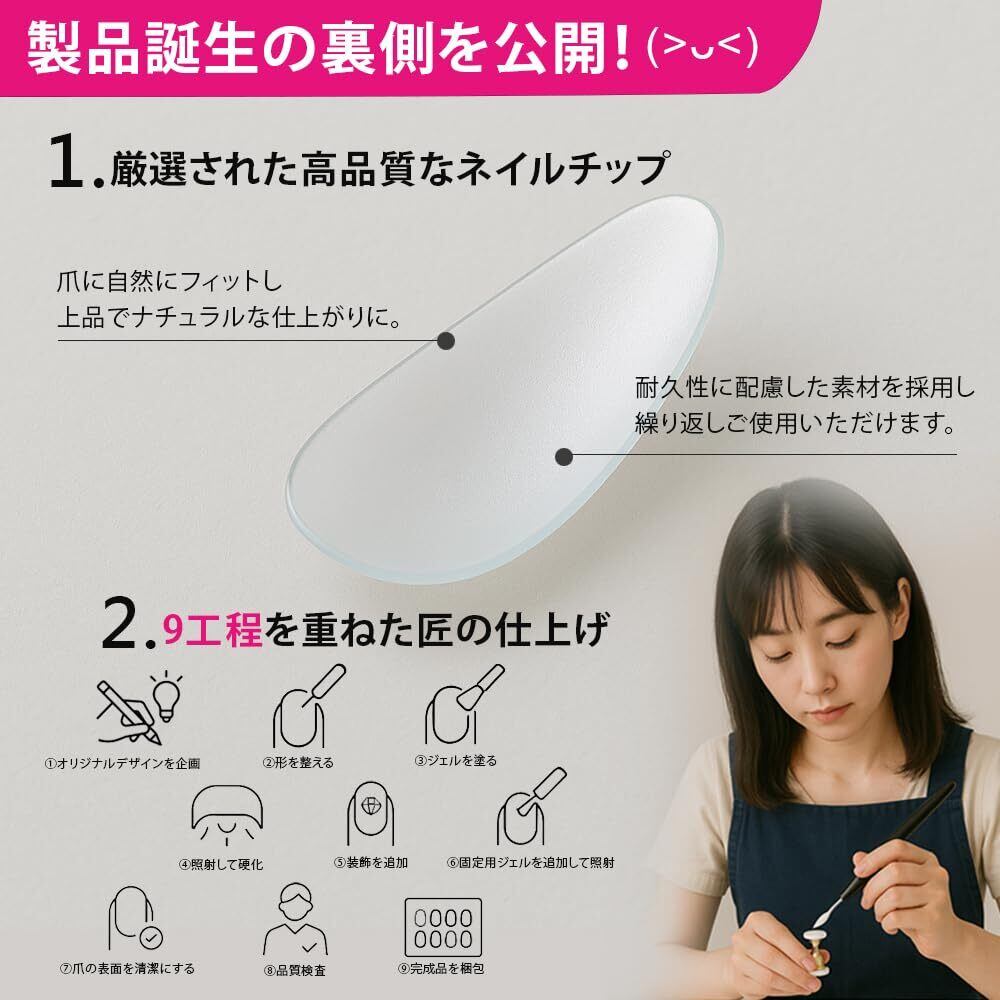 「職人仕上げのネイルチップ、洗練された指先へ」 ロット生産ではなく、一つひとつ丁寧に仕上げた手作りネイルです。上品でどんなファッションにも馴染み、指先からエレガンスを演出。特別なデザインにより、お客様の個性を引き立てます。