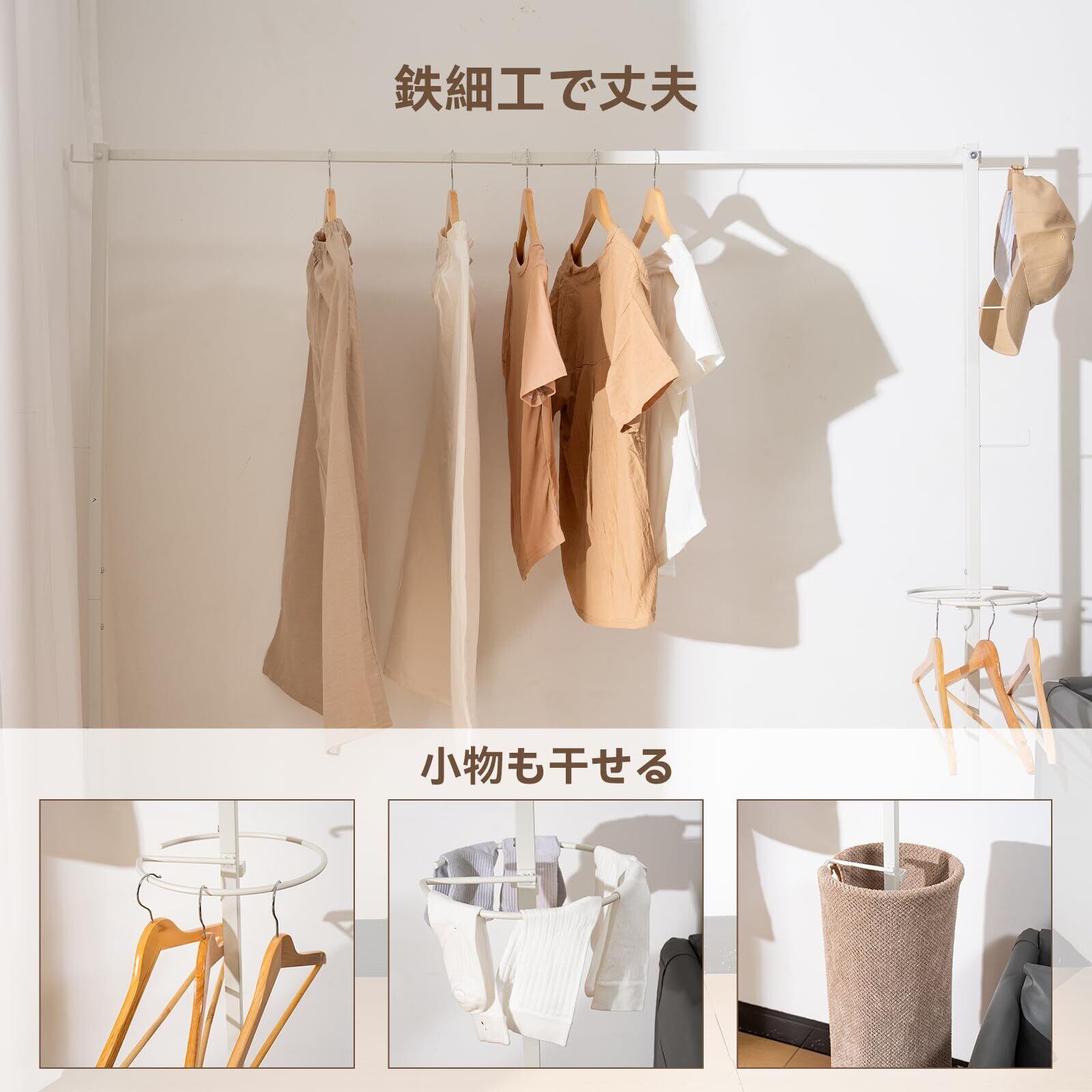 【室内で物を干す様々なシーンに適用】洗濯物を干すために使用することができ、また、布団を干す時にも、収納してコートやカバンをかけるにも便利です。リビングやベッドルームなど、様々な場所で使用することができます。シンプルでスタイリッシュなデザインも、部屋のインテリアに馴染みやすいです。