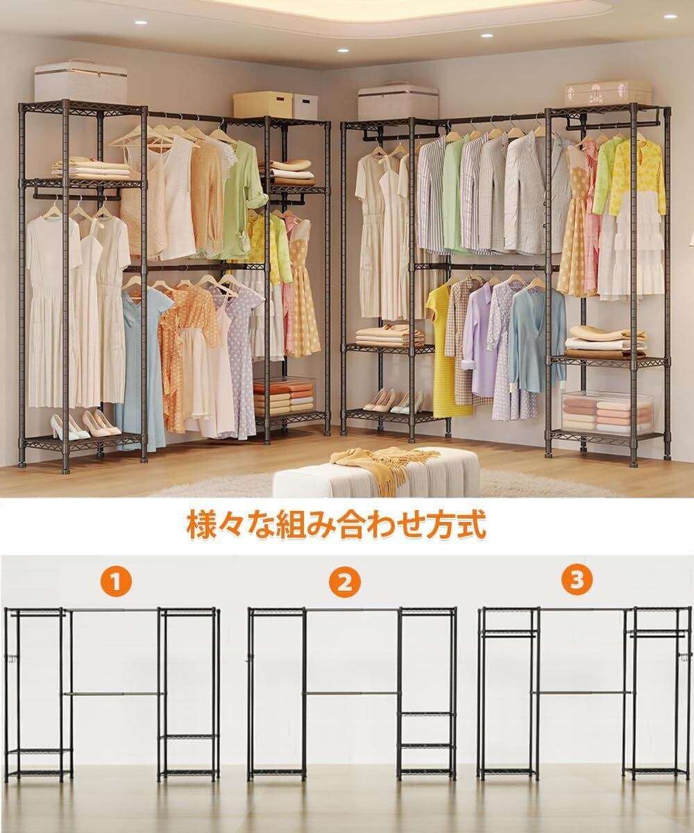 【様々な組み合わせタイプ】ポールに入った溝で棚板の高さが変えられるので、収納する物に合わせて、ムダなく最適なスペースで収納できます。伸縮ポール2本使わない時は、洋服かけラックは単独の2つの収納ラックに変身します!シンプル収納棚には衣類、日常の小物などを簡単に収納できるし、下に靴やポクッスなども便利収納できます。