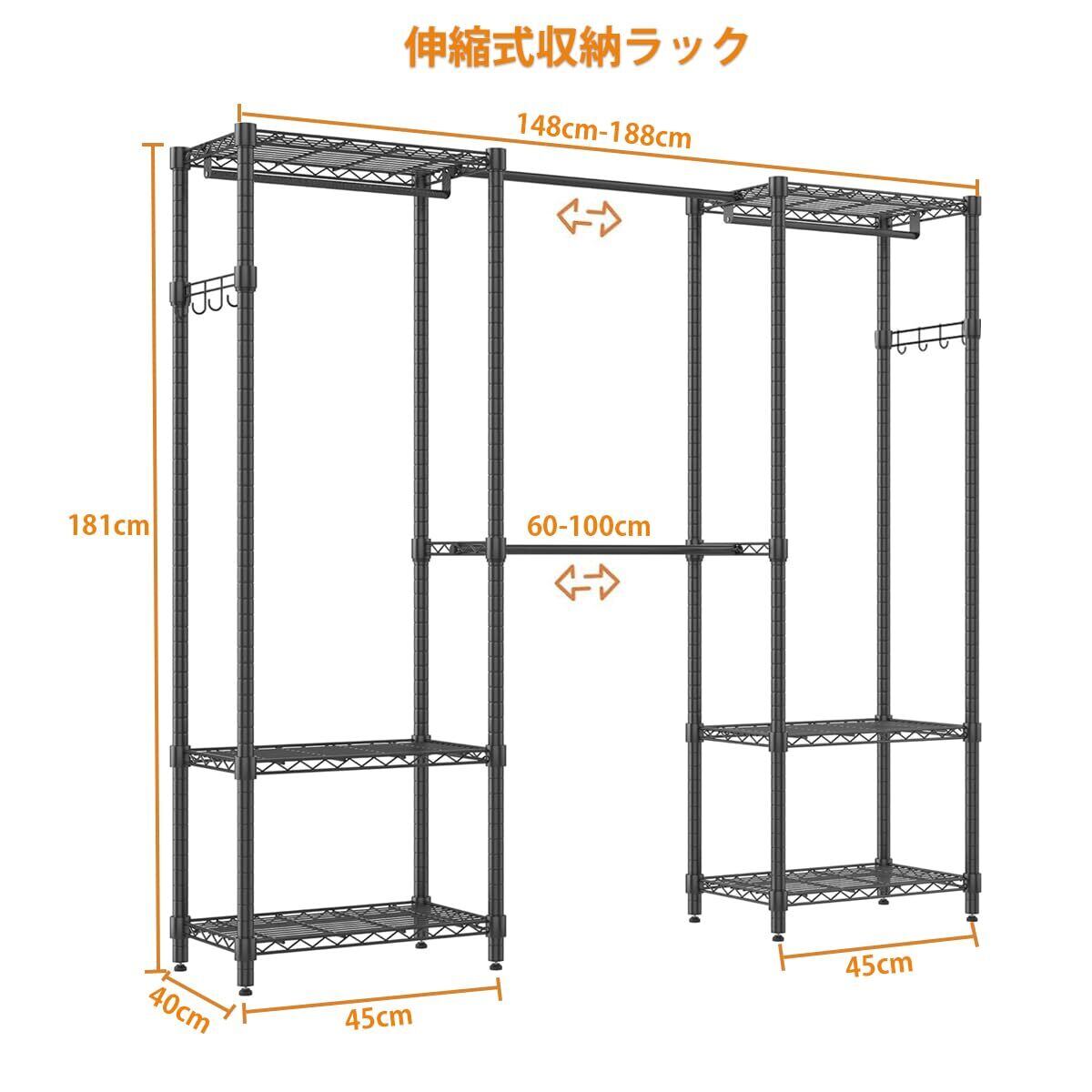 ハンガーラック 大容量 伸縮 幅148~188cmワードローブ メタルラック 頑丈 洋服ラック洋服掛け 組み立て簡単 衣類収納 高さ調節 省スペース おしゃれ ハンガーかけ コートハンガー 洋服収納 (ブラック, 幅148-188×奥行40×高さ181cm)