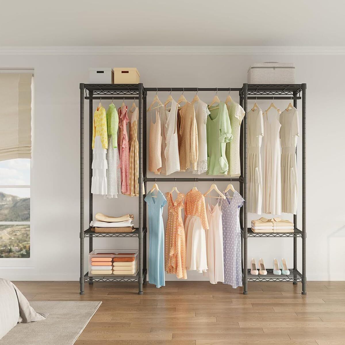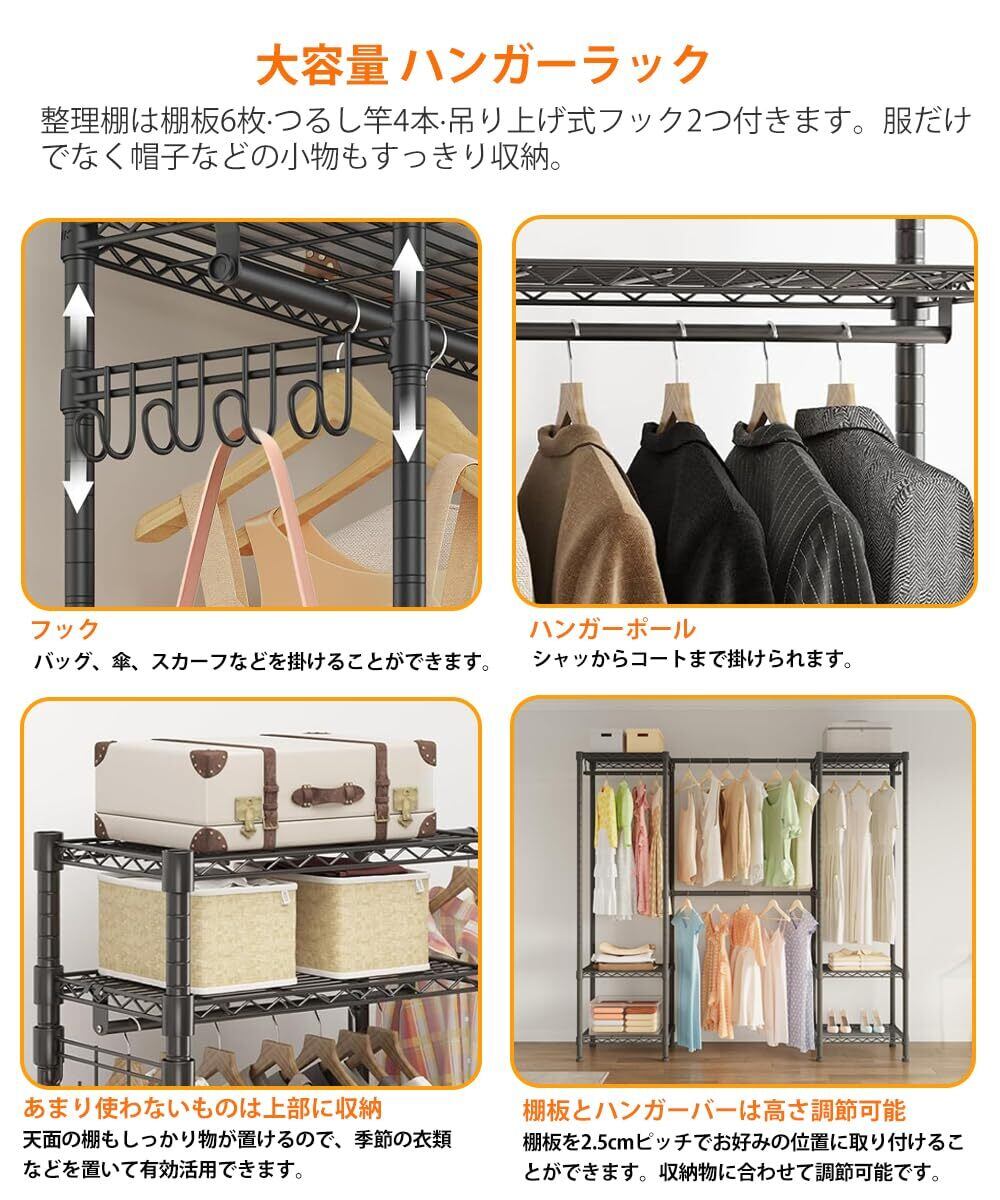 【ハンガーラック大容量】整理棚は棚板6枚・つるし竿4本・吊り上げ式フック2つ付きます。服だけでなく帽子などの小物もすっきり収納。ラック上部と下部にかごや収納ボックスを置くと収納力アップ!狭い寝室でもコンパクトなクロークでも、この設計は床面積を効果的に節約しながら、衣類やアクセサリーの適切な保管を確保することができます。
