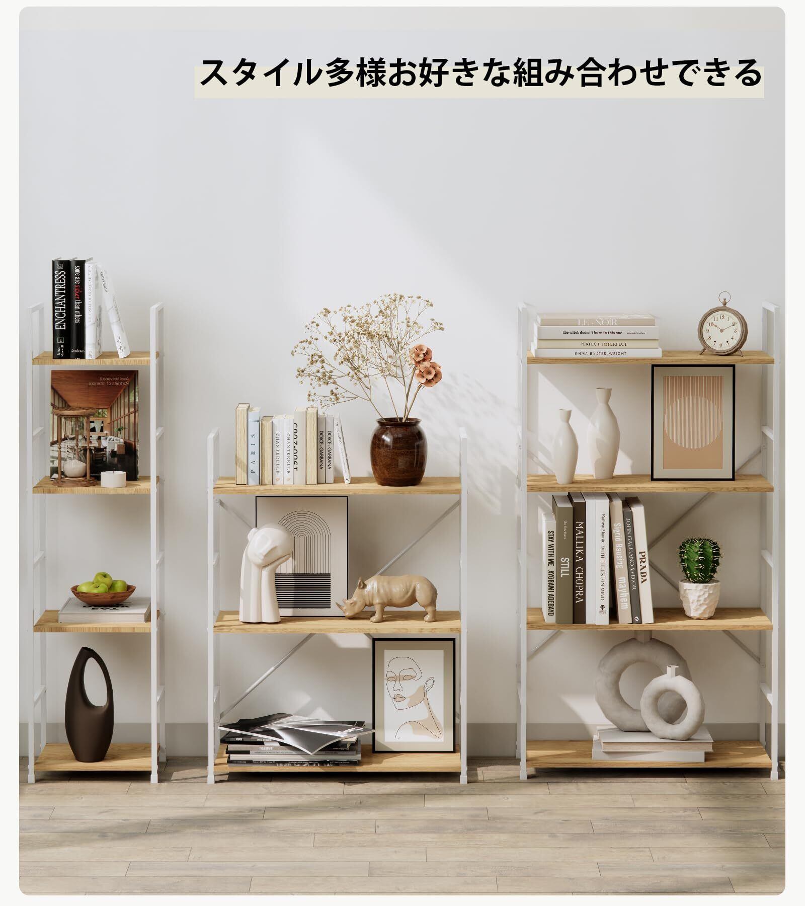 リビングルームで展示台として植物や花とか展示して、書房で本棚としてアルバムやブック漫画とか収納して、キッチンの狭いスペースで小物の収納ラックとしていろんな場所でぴったりです。