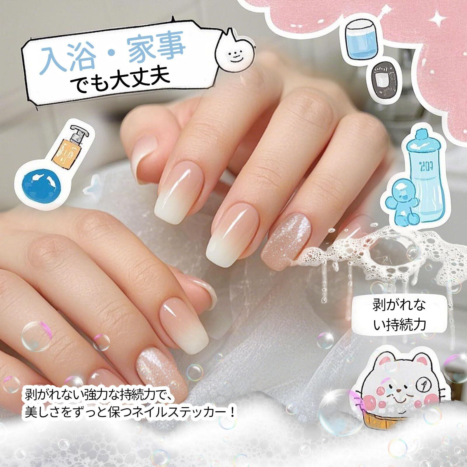 【貼り付け簡単、スピーディーな操作】専門的なネイル技術は不要で、ジェルネイルシールを爪の表面に直接貼り、適切な形にカットするだけ。UVライトの硬化も不要で、いつでも簡単に仕上げられます。初心者や忙しい方に最適です。