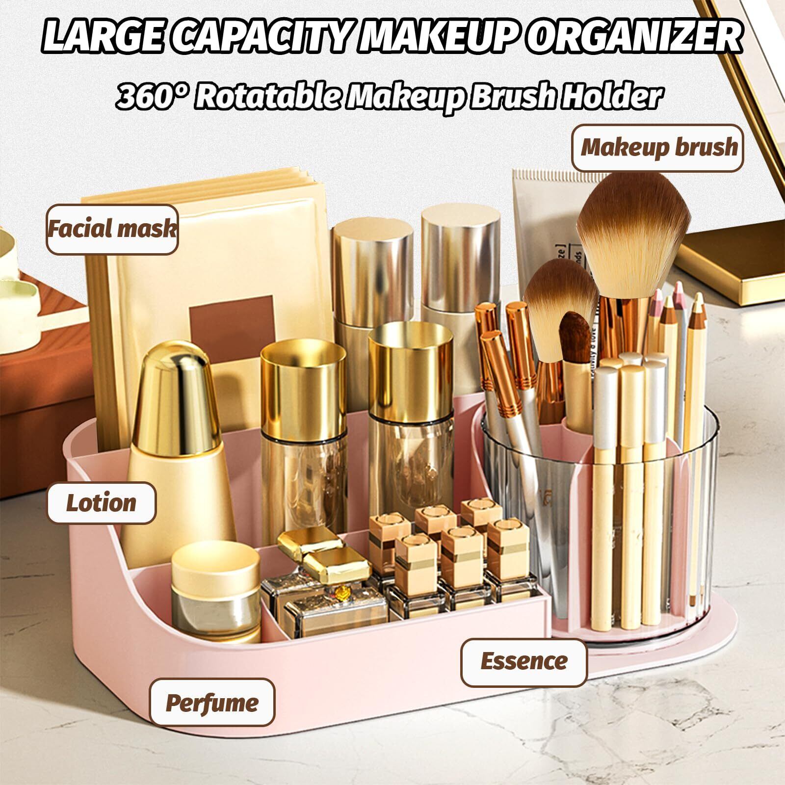 DASITON 大容量メイクアップオーガナイザー、360°回転メイクブラシホルダー付き、香水、スキンケア収納オーガナイザー、化粧台、浴室カウンタートップ用、化粧品ディスプレイケース(ピンク、1段)