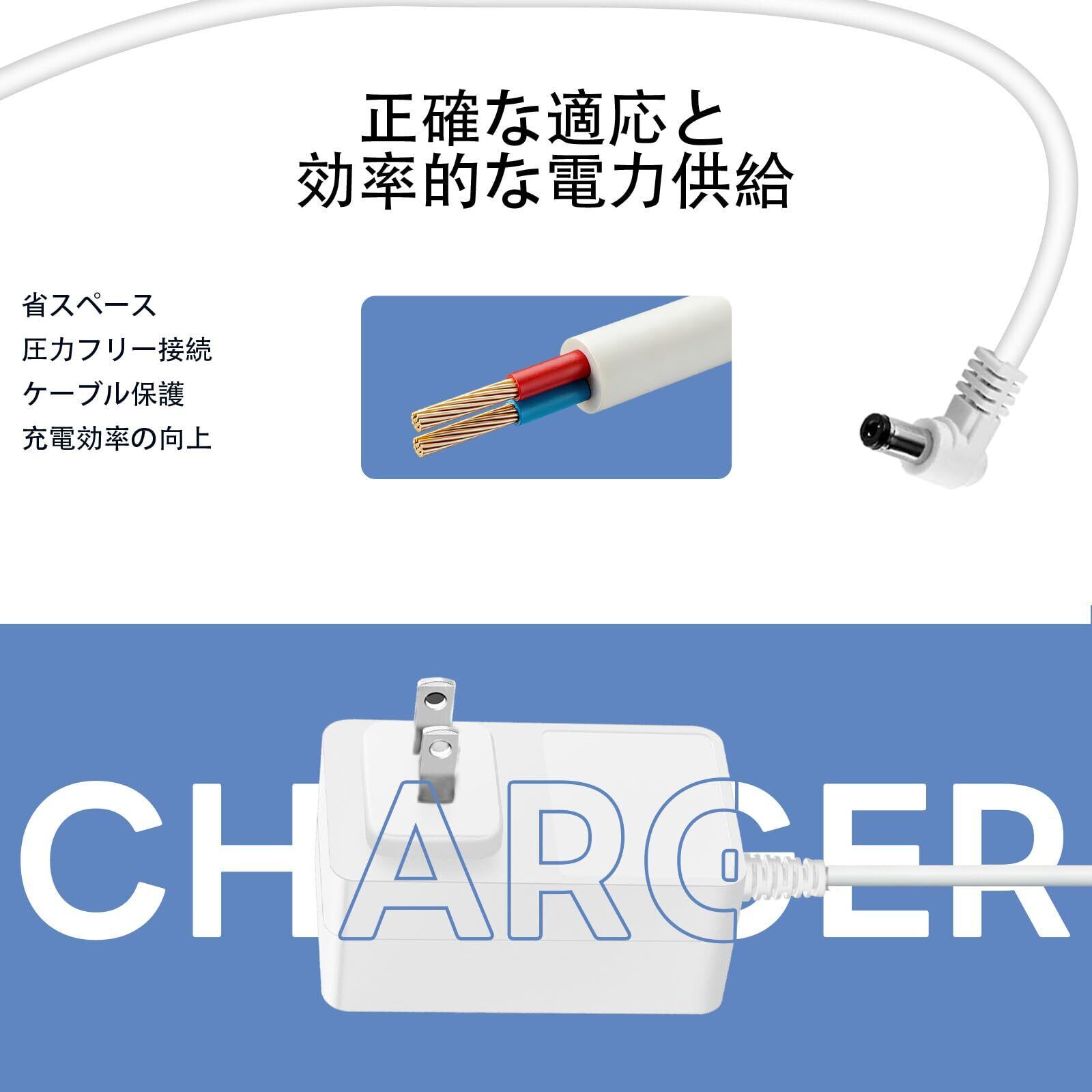 「製品仕様」入力: 100-240 V 50-60 Hz、出力:24 V 1.5 A、充電ケーブル長: 180 cm