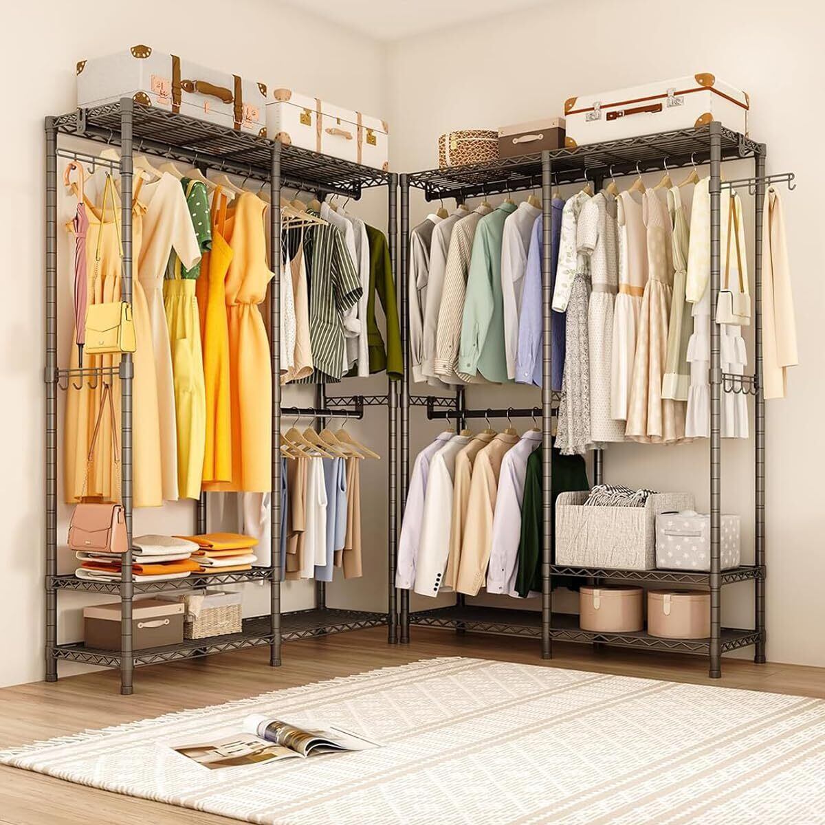 【一人でも組み立てOK】洋服収納ラック分かりやすい簡単な構造は、ネジ・釘を使わなく、部品を掛けるだけで楽々組み立てできます。安全に設置できる壁面取り付け金具付きます。解体も容易なので、引っ越し先にも持っていくことができます。