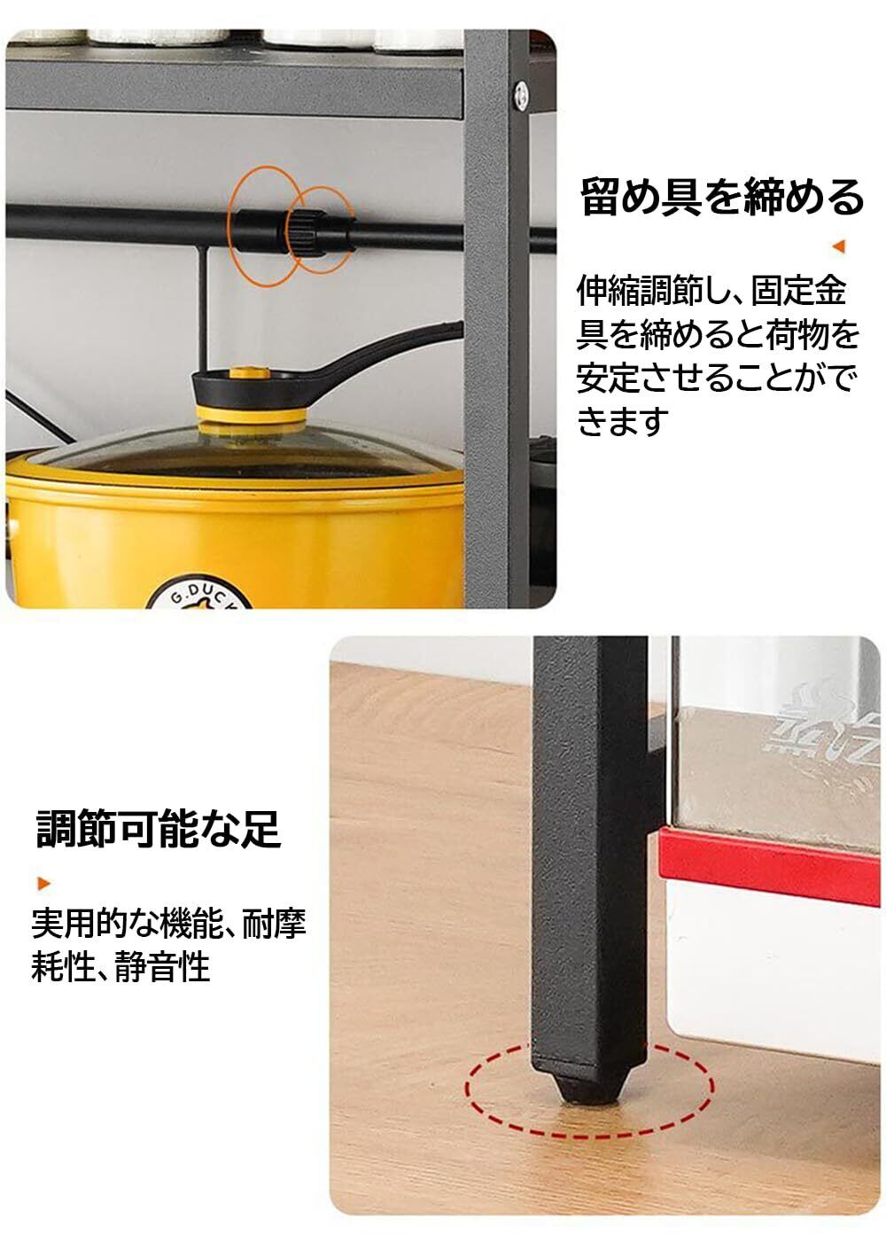 電子レンジ上のデッドスペースをフル活用!幅36~65cmで無段階調整、高さも3段階調節可能。キッチンのサイズに合わせてスッキリ設置。S字フック付きで吊り下げ収納も楽々。