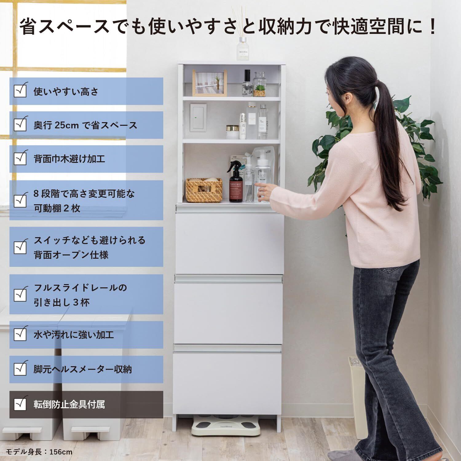 高さ約154.5cmで女性でも使いやすい高さです。 引き出し上95cmより上はオープン棚収納でスイッチなどを隠すことなく使用できます。 引き出し3段はフルスライドレールで使いやすい設計 オープン棚の棚板は高さを8段階で付け替え可能です。引っかけるだけの簡単設置 転倒防止金具・背面補強パーツ付き 巾木避け・脚元ヘルスメーター収納スペース有
