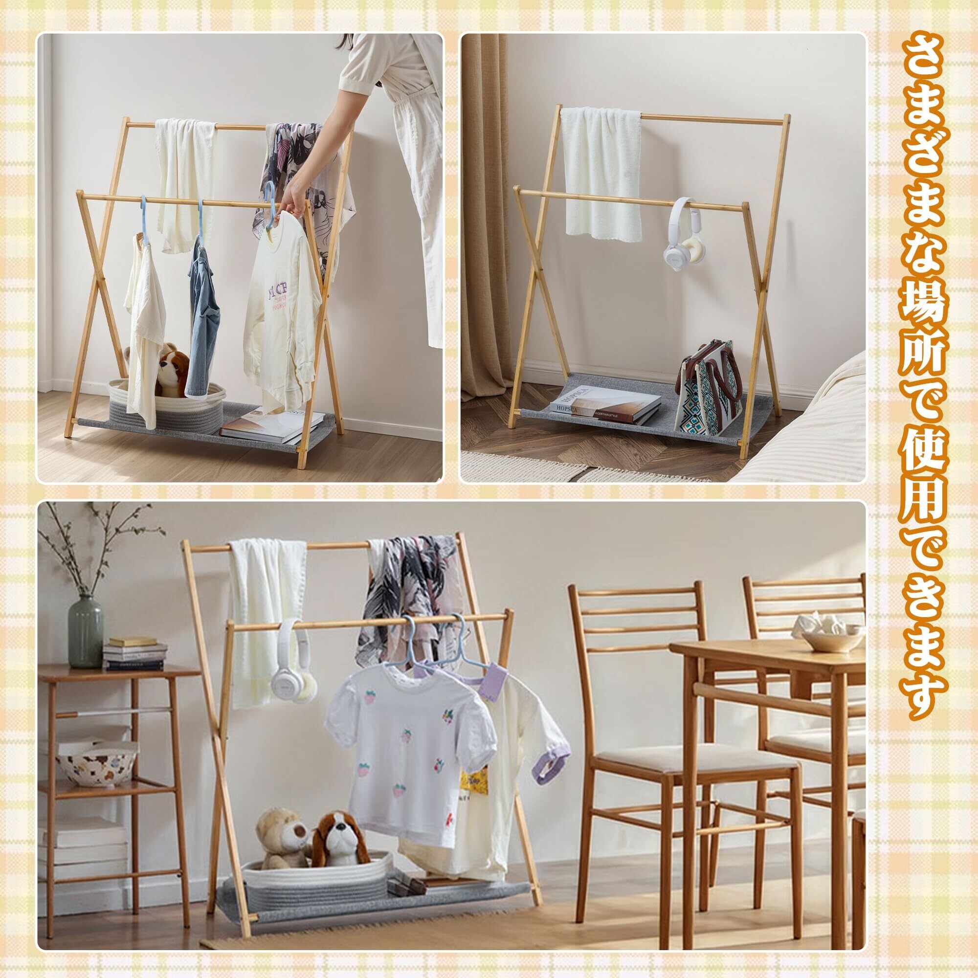この折りたたみ式竹製ハンガーラックは、エコフレンドリーで使い勝手の良いデザインが特徴です。