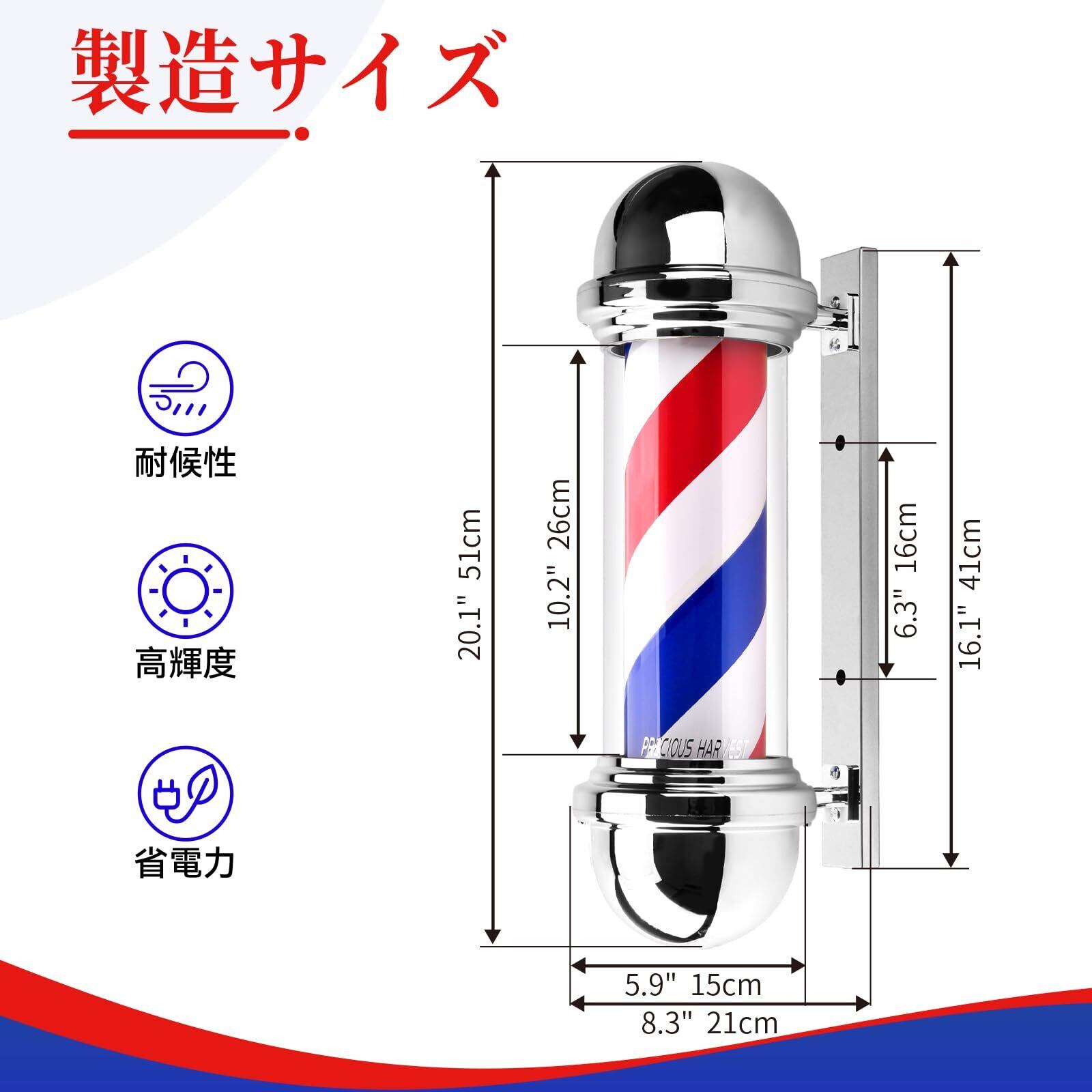 50cm 壁掛け式赤青白ストライプ床屋回転照明、黒/金/銀カバー選択、LED省エネ光源、クロム加工 (銀色)
