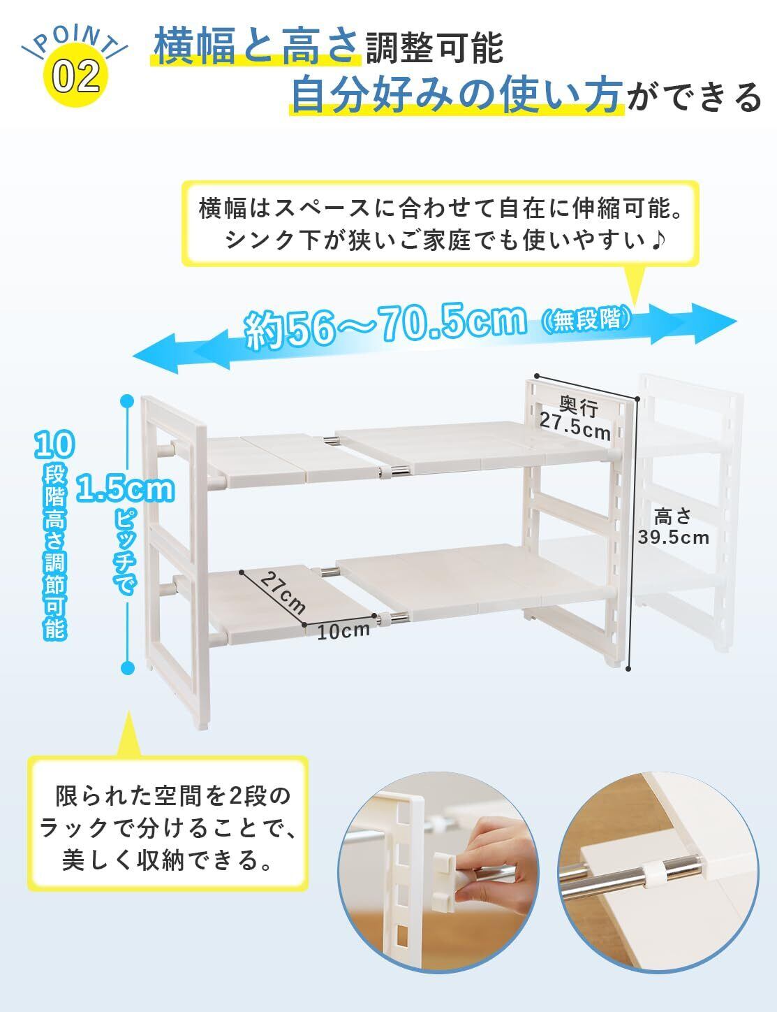 【シンク下を最大限に生かす ぴったり合うTITIROBA伸縮2段ラック】横幅はスペースに合わせて自在に56cm~70.5cm無段階伸縮可能、シンク下が狭いご家庭でも使いやすい。棚板は1.5cmピッチで10段階高さ調節可能、限られた空間を2段のラックで分けることで、美しく収納できる。棚板を好みの位置に調整できるのも使いやすいポイントである。