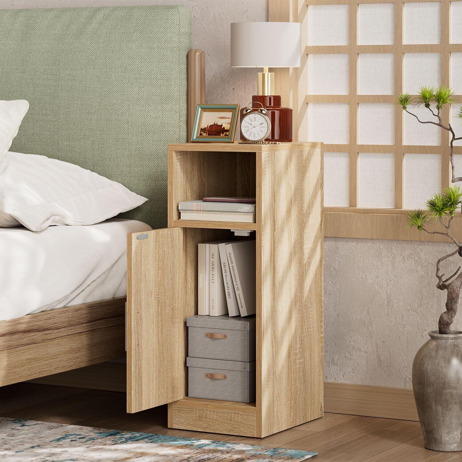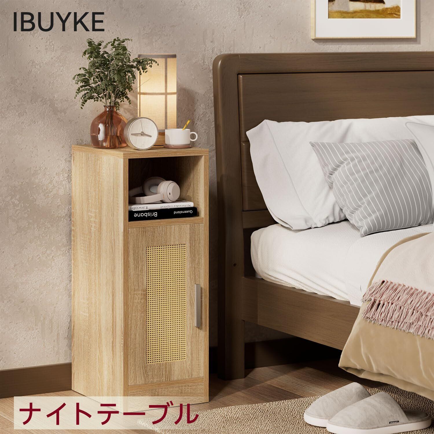 IBUYKE ベッドサイドテーブル ナイトテーブル ベッド横 テーブル 籐編み MDFボード 収納 扉付き すき間収納 スリム 木製 組立簡単 一人暮らし 和風 省スペース リビングルーム ベッドルーム用 ナチュラル JPWNS012N