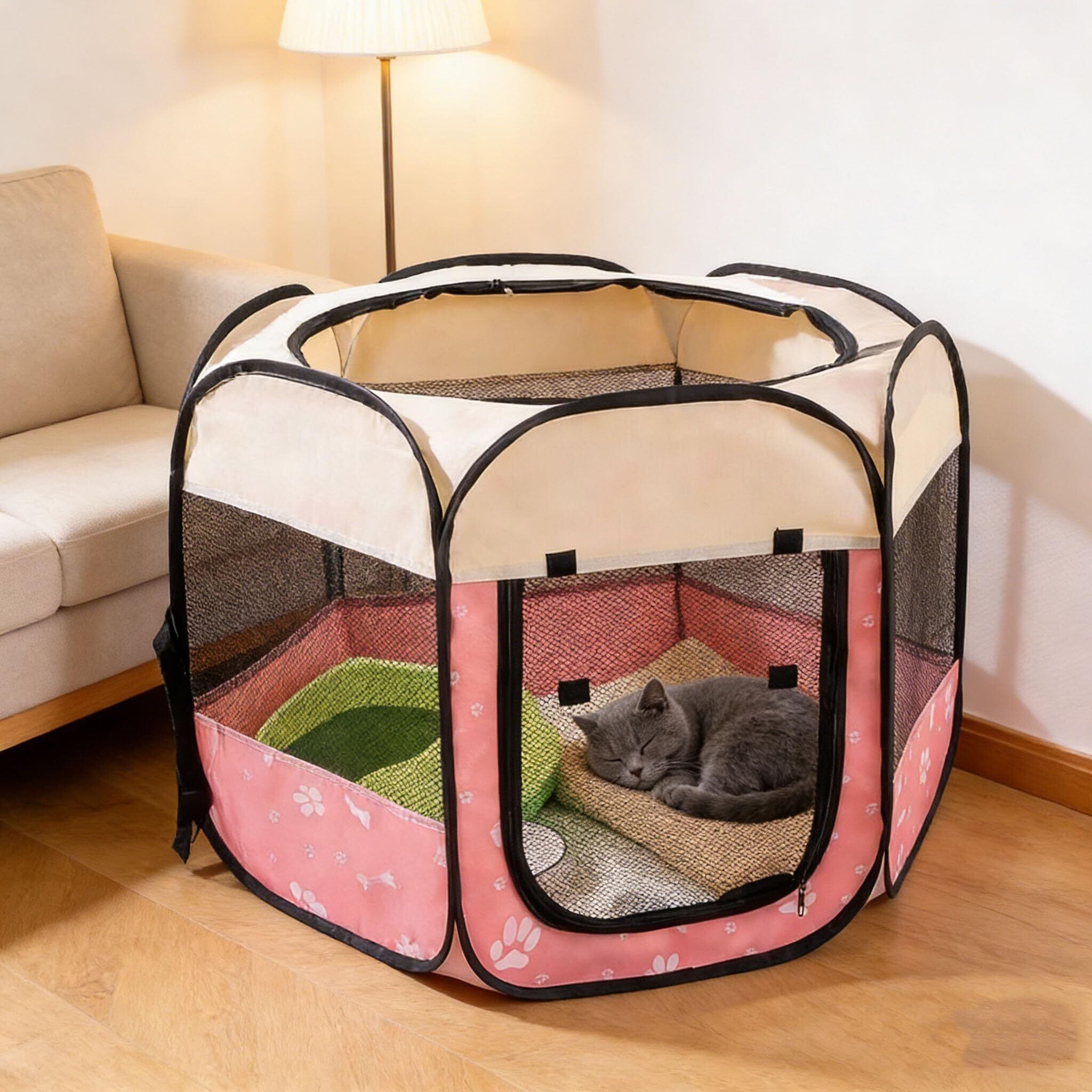 六角形 折りたたみ式 ペットサークル 組み立て不要 キャリーバッグ付き 猫 犬用 ケージ メッシュサークル 軽量 コンパクト 防災 通気性 室内外兼用 幅70cm×高さ53cm (S, ピンク)