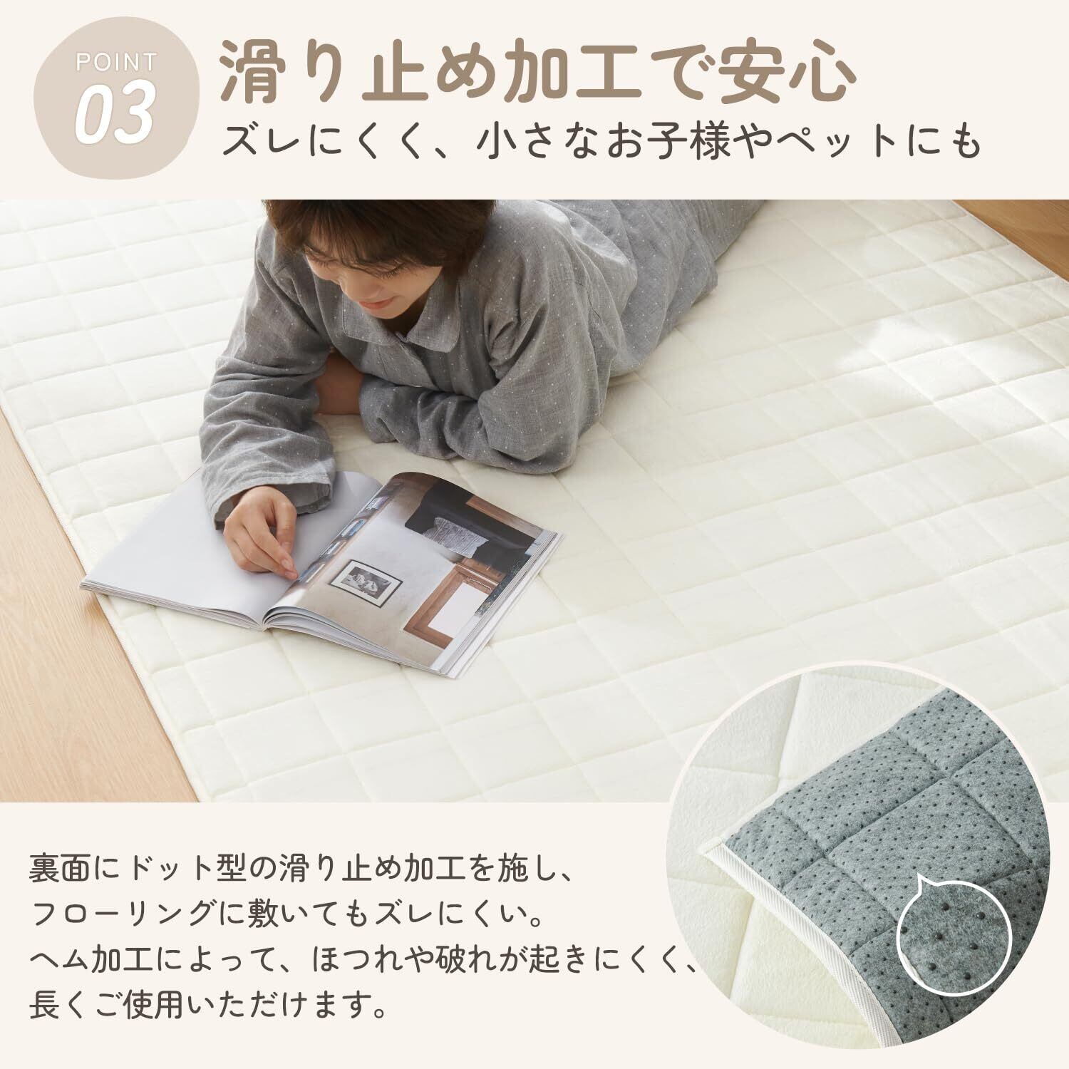 【滑り止め付きでズレにくい】裏面に滑り止め加工を施し、フローリングでもズレにくい仕様。小さなお子様やペットのいるご家庭でも心配なくお使いいただけます。