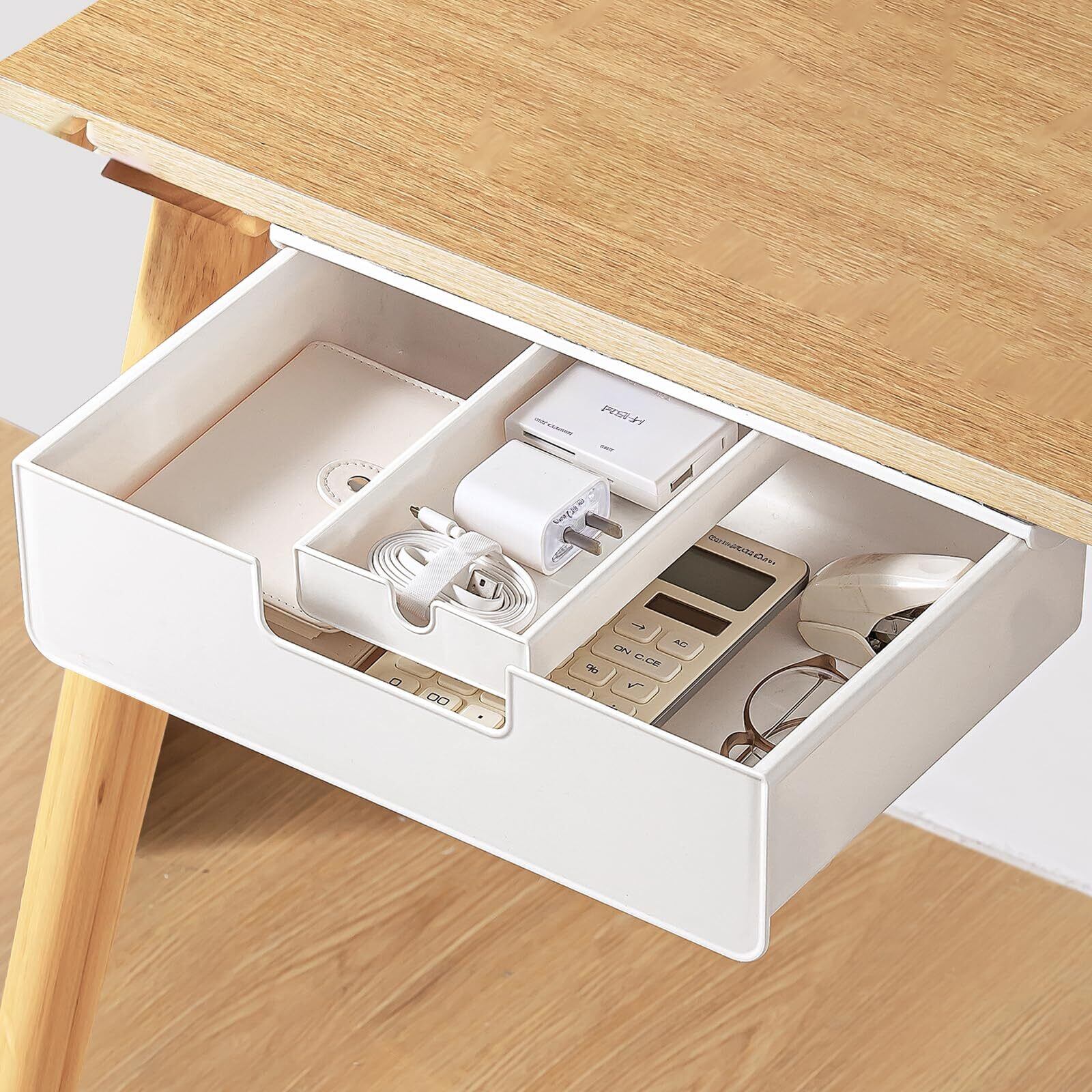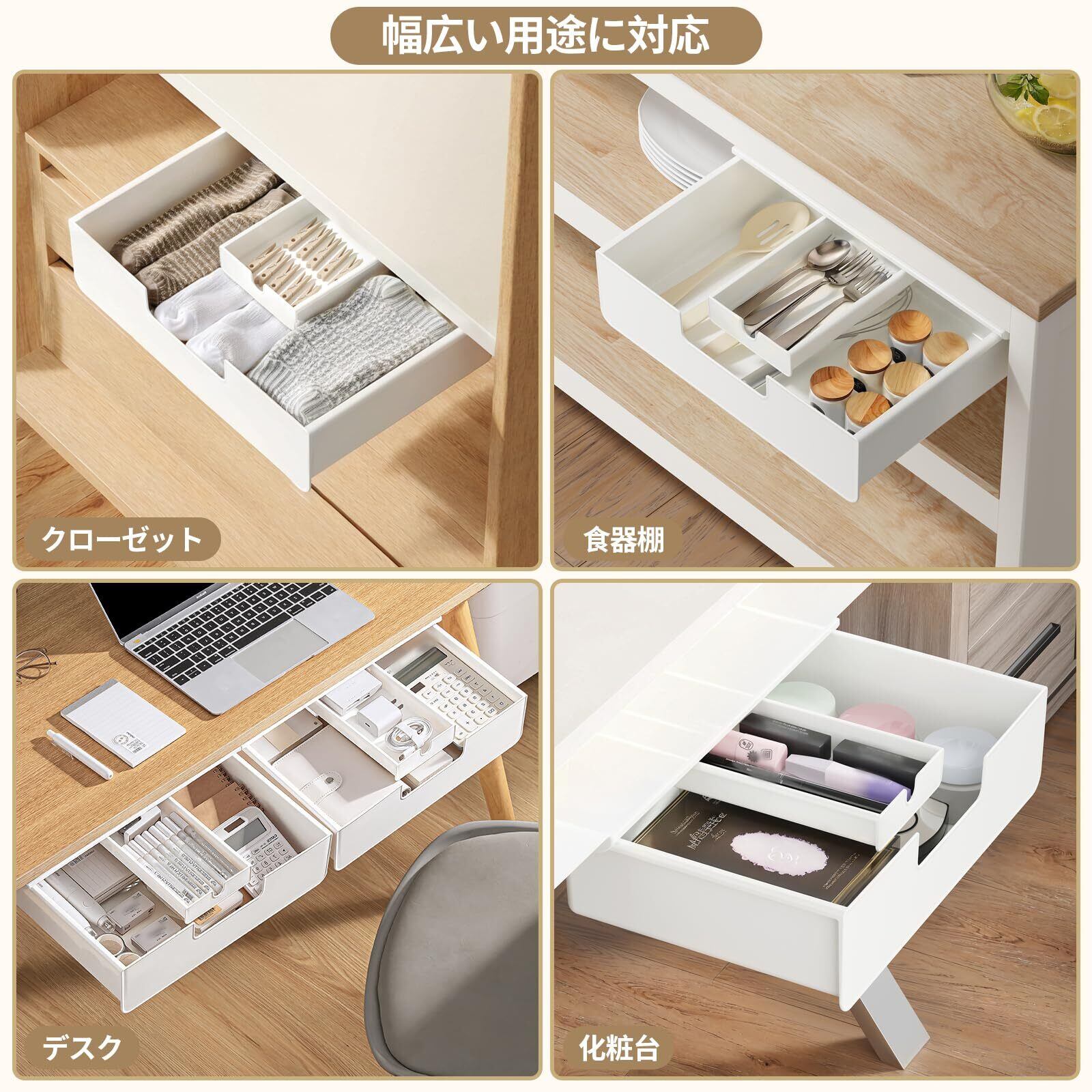 【省スペース】デスク下にスッキリ収納できる隠し引き出し。机上の散らかりを解消しながら、文房具やリモコンを手の届く位置に保管可能。毎日使用するデスク周りに散らばった小物をの整理整頓に役立ちます、デスク収納空間を広げます。