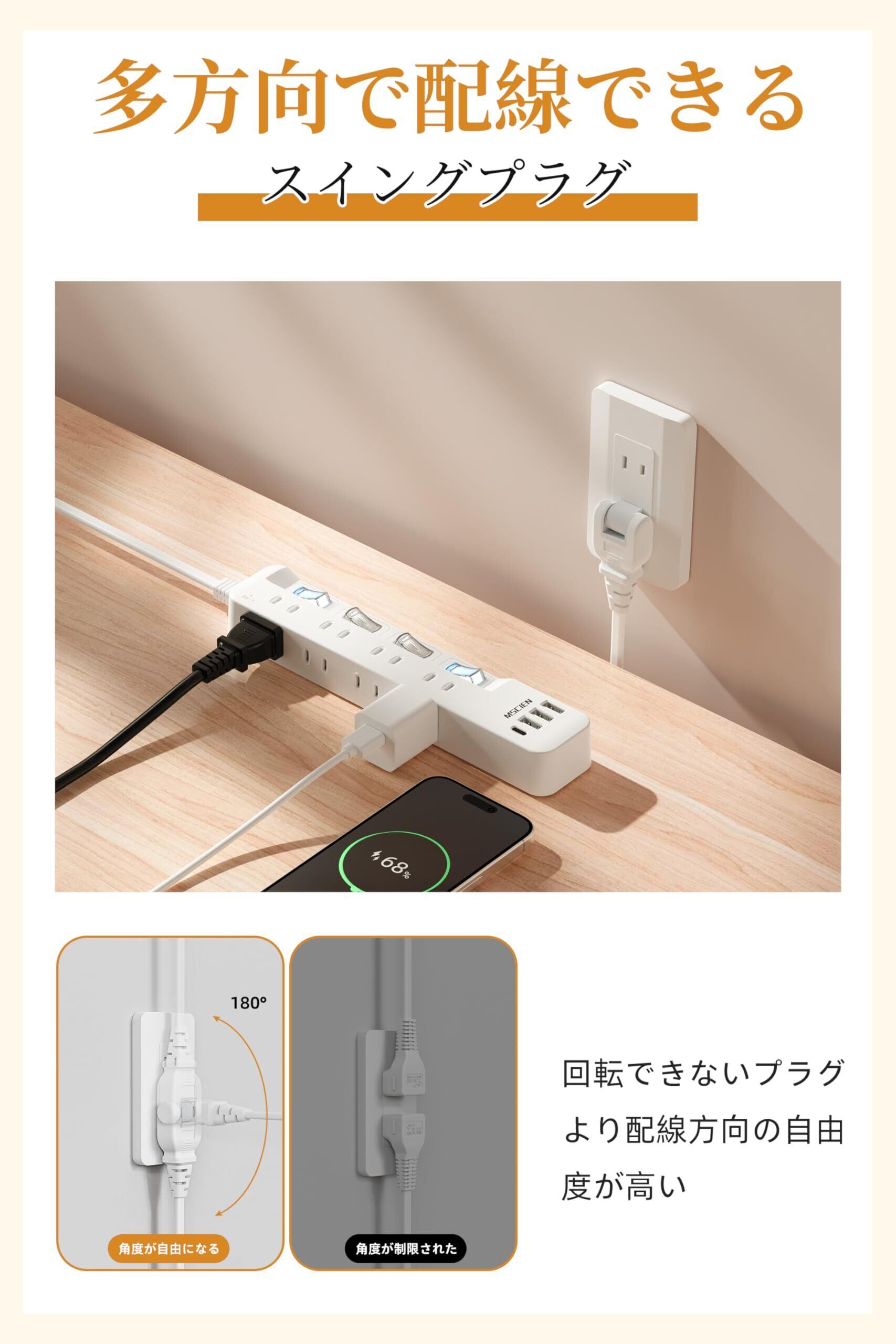 Mscien 電源タップ usb付き 8個AC口 1個usbc 3個usba 延長コード 2m 雷ガード usb コンセント oa スイッチ付き 壁掛け たこあしコンセント テーブル マルチタップ スイングプラグ おしゃれ (2M)