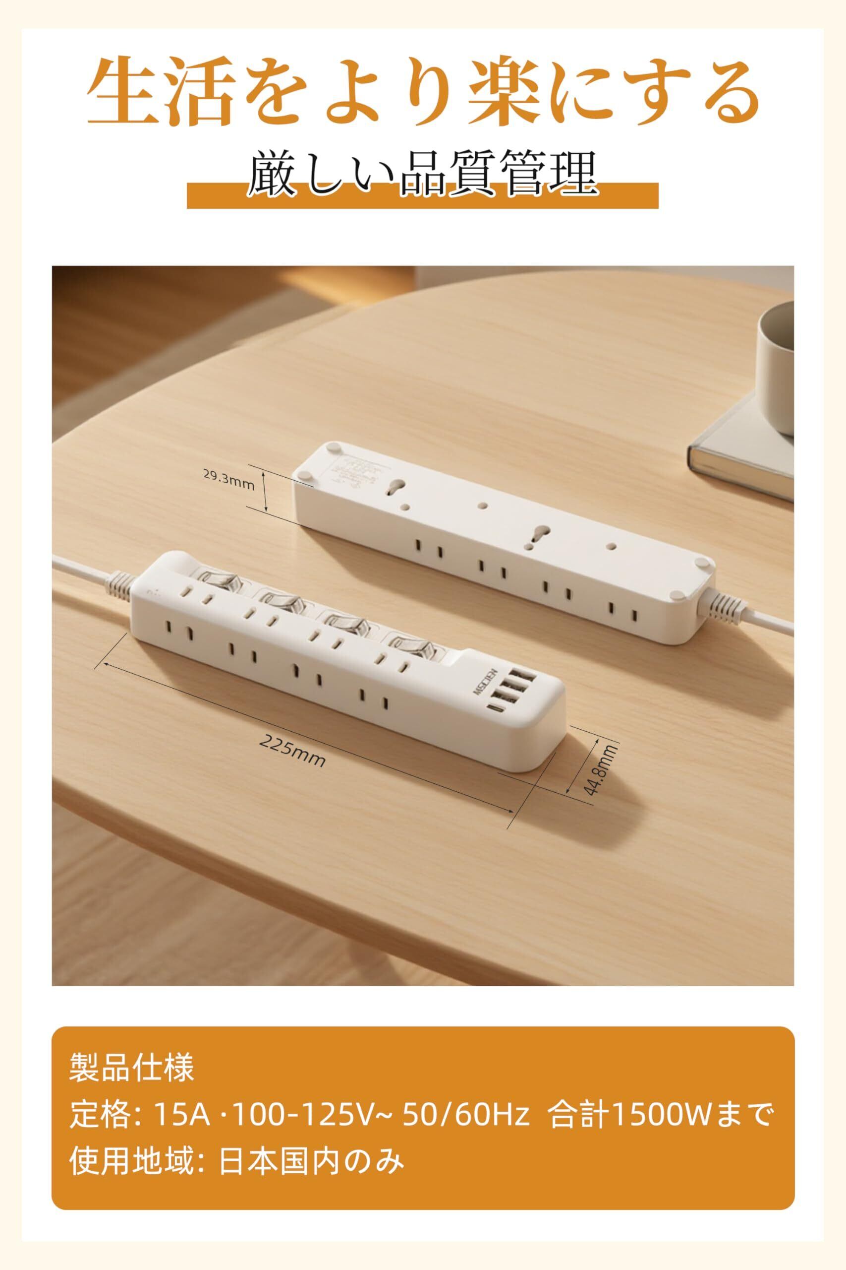 【一台12役・USB付き・2m延長コード】1つのUSB-Cポート、3つのUSB-Aポートと8つのAC差込口を搭載したマルチタップです。2m延長コードを採用し、コンセントから離れた場所で使えます。延長コードの一部は製品本体内部に取り付けられるため、表示の製品線長には本体の長さが含まれております。