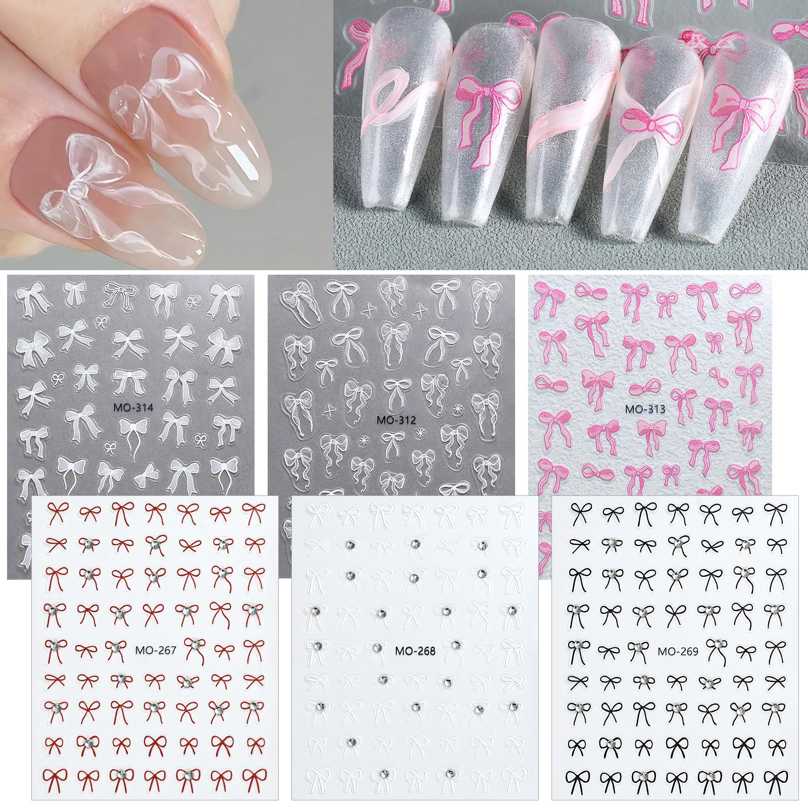 【ラインストーン付き】ネイルシールは6枚入りで、セットのうち3枚はラインストーン付きのリボンとシンプルなリボンがミックスされているので、お好みで組み合わせてもいいです