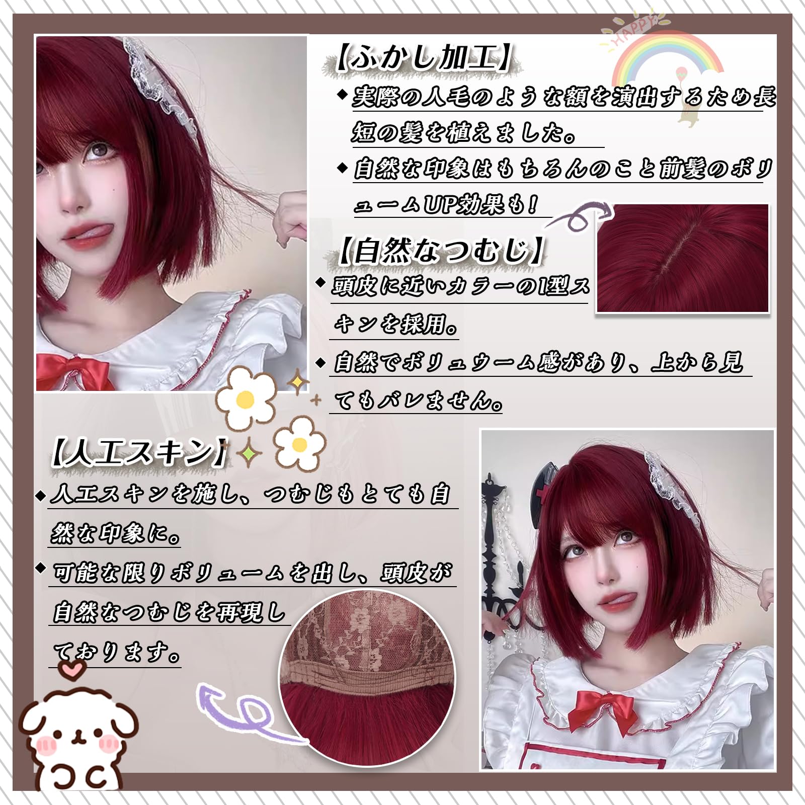 Hawkko ウィッグ ボブ ショート フルウィッグ かつら インナーカラー レディーズ ストレート カツラ ぱっつん 前髪 wig 女装ウィッグ 自然 ハロウィン 小顔 原宿系 コスプレ ロリータ ぱっつん前髪 日常 耐熱 ネット/櫛付き(マーメイドローズレッド)