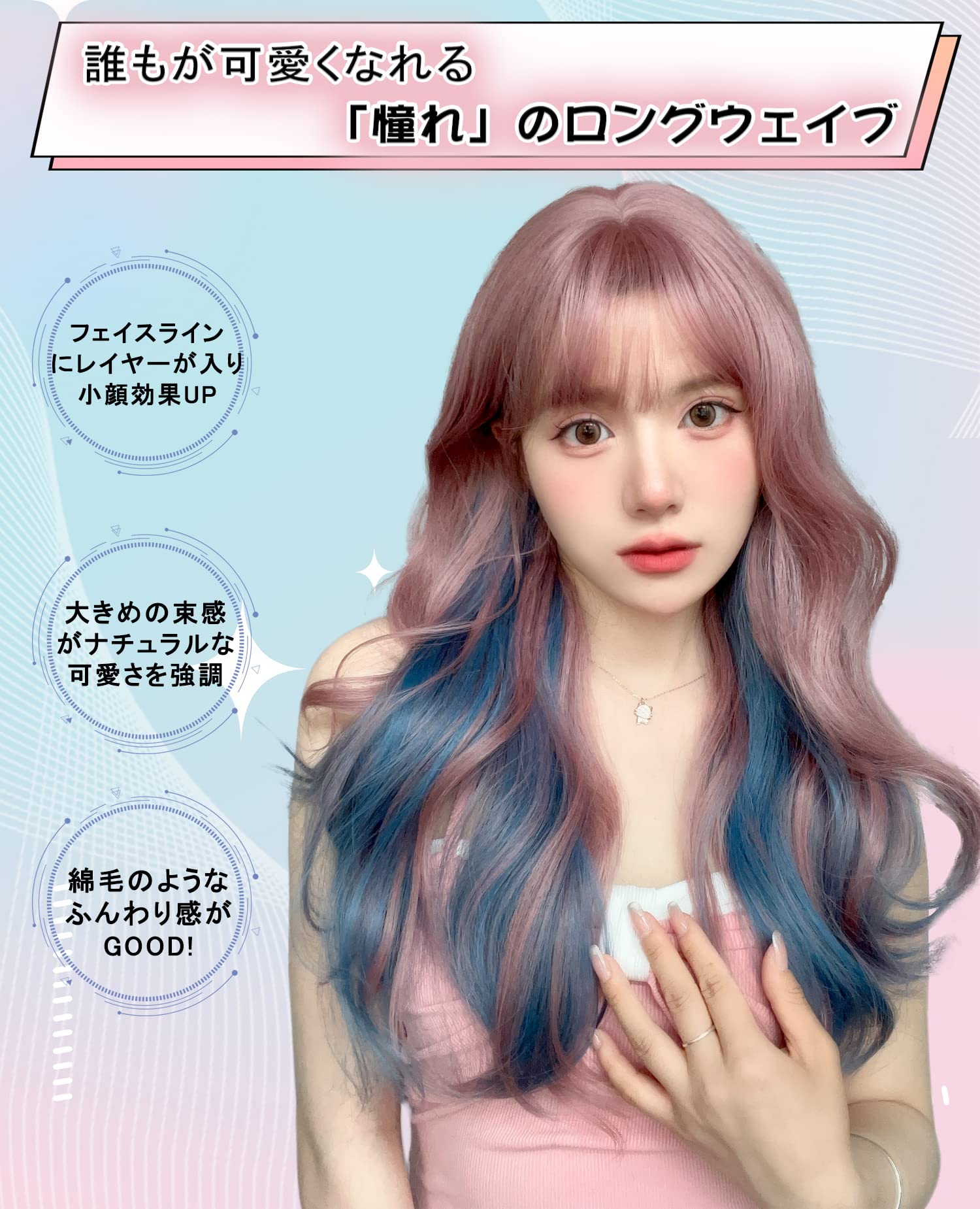 誰も可愛くなれる「ふんわりウェーブウィッグ」です。すこし長めのレイヤーは入っているので、フェイスラインをカバーして小顔効果UP!洗練されたゆるめのウェーブが、さらに愛らしいイメージをアップ。地毛だとセットが大変なロングウェーブもウィッグなら簡単に再現可能。