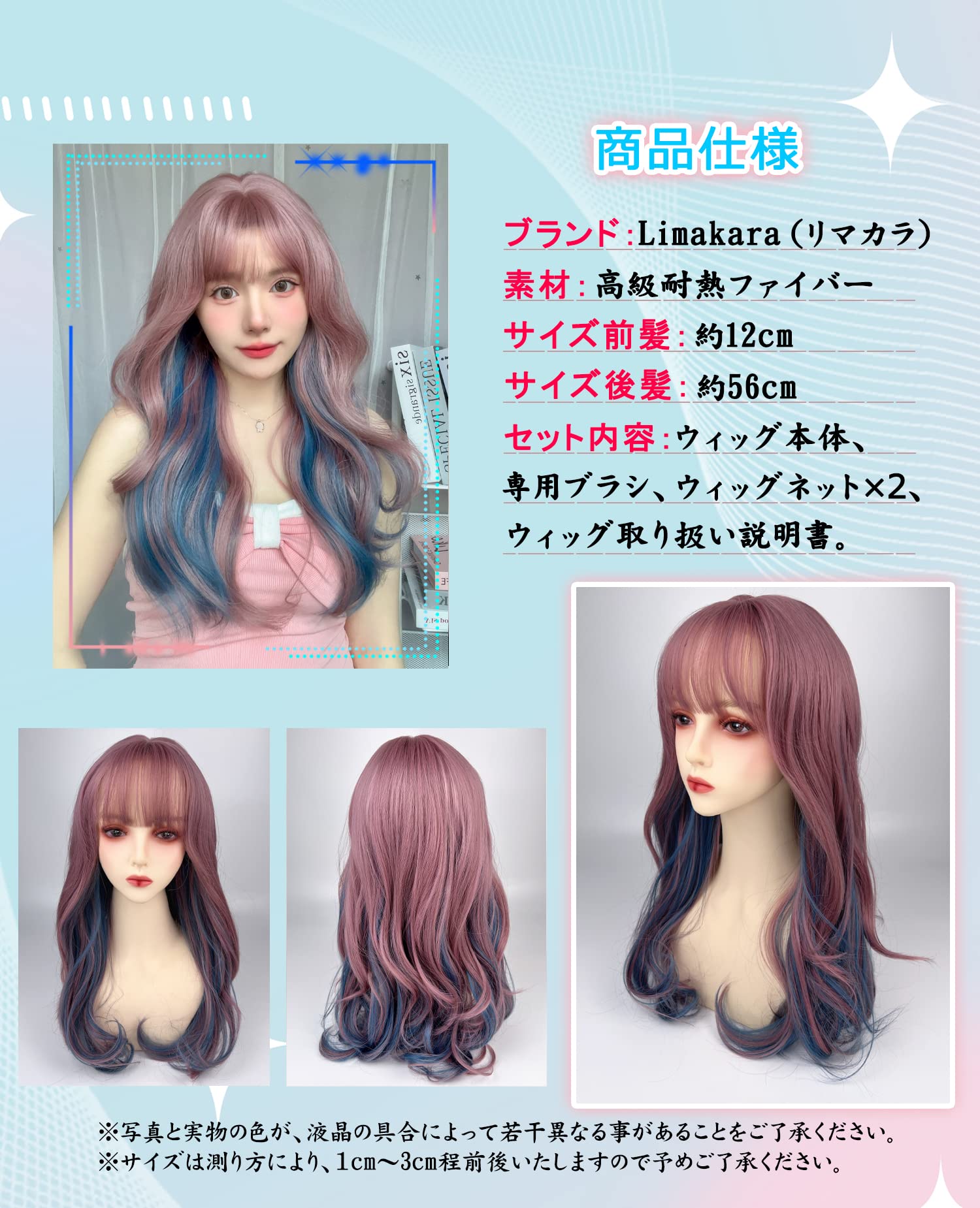 Limakaraウィッグ ロング 巻き髪 インナーカラー セミロング カール フルウィッグ かつら レディース コスプレ ギャル 自然 ぱっつん 原宿系 小顔 人気 耐熱 wig ファッション ネット/櫛付き ツートン バイオレットブルー