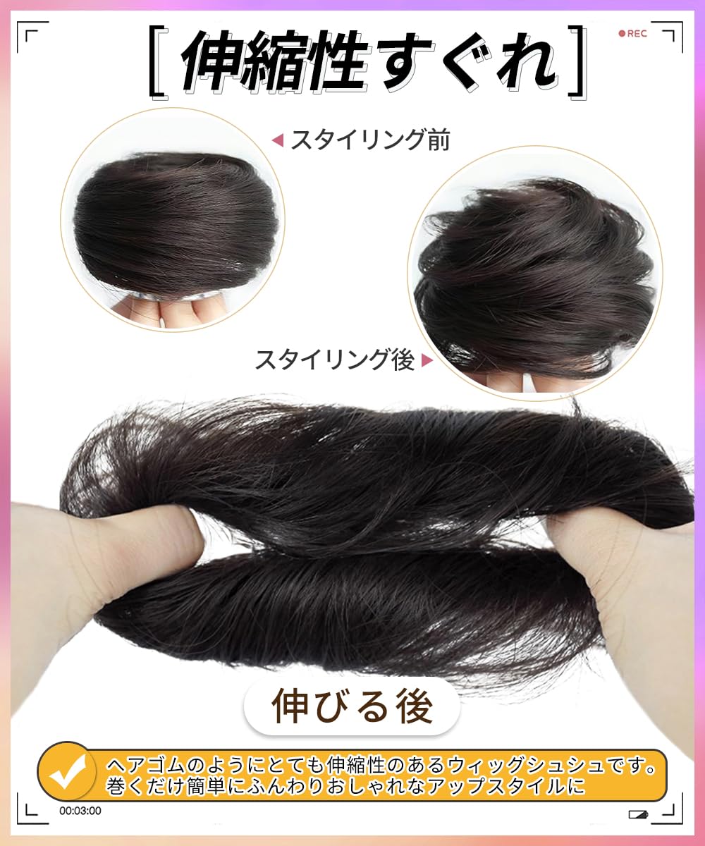 【装着簡単のゴム式】:手軽に使えるシュシュタイプ、地毛やフルウィッグに簡単に装着でき、ポイントウィッグとの相性も抜群です。