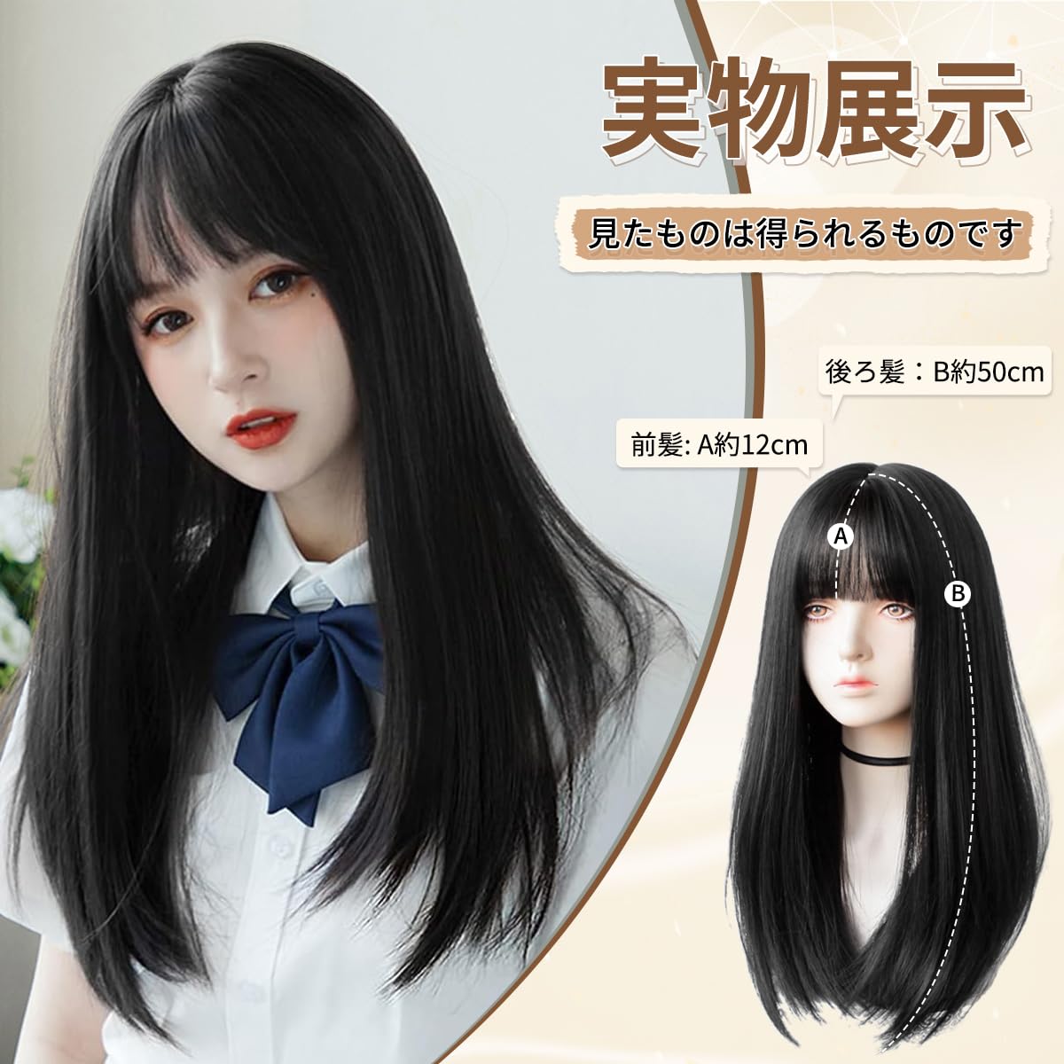 【サイズ】前髪:約12cm 後髪:約50cm 頭周り:最大約56㎝ 重さ:約210g