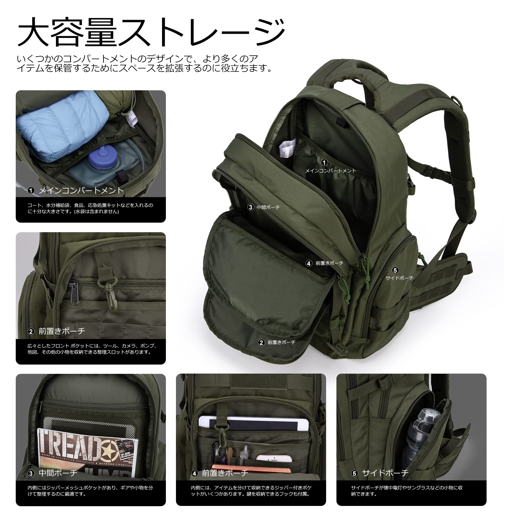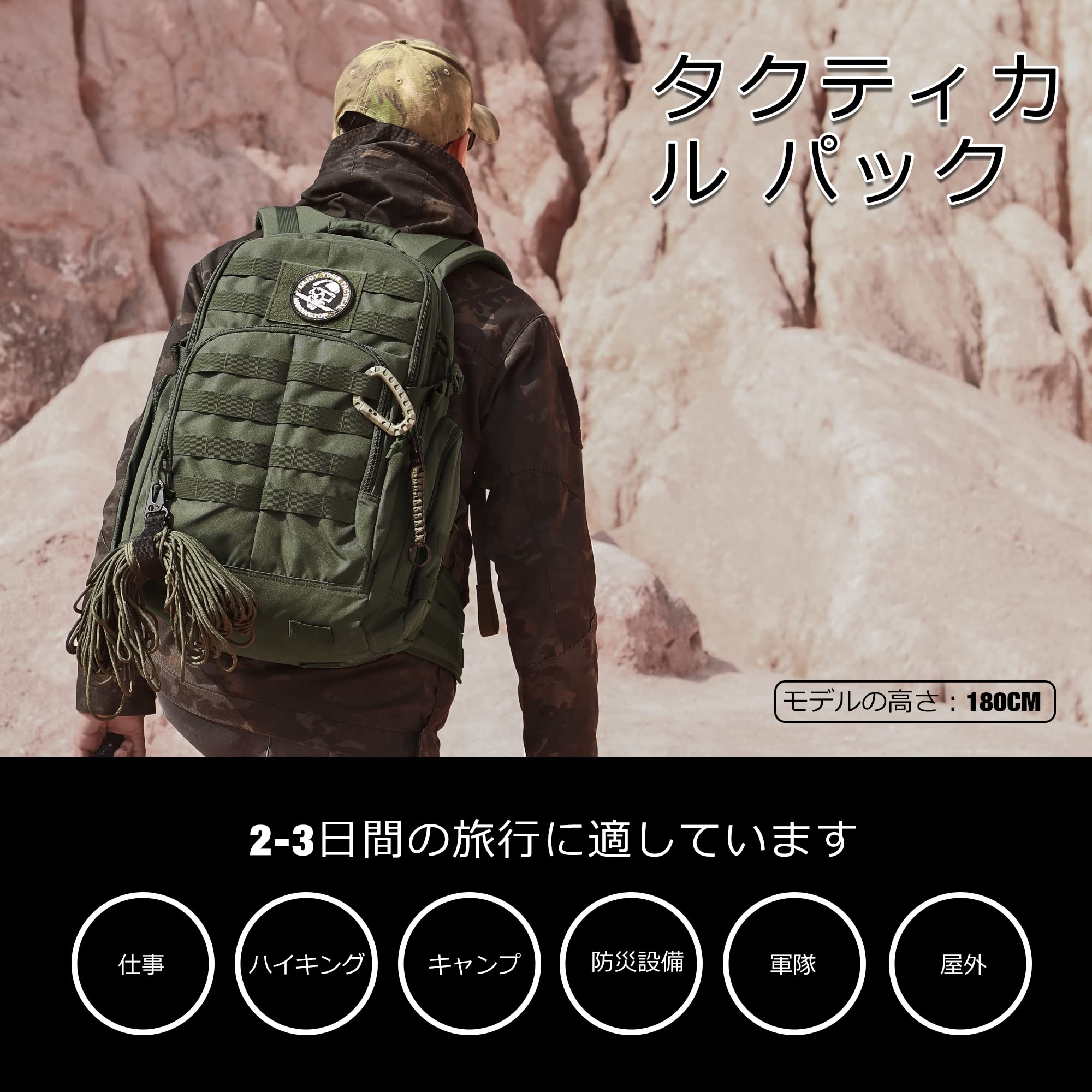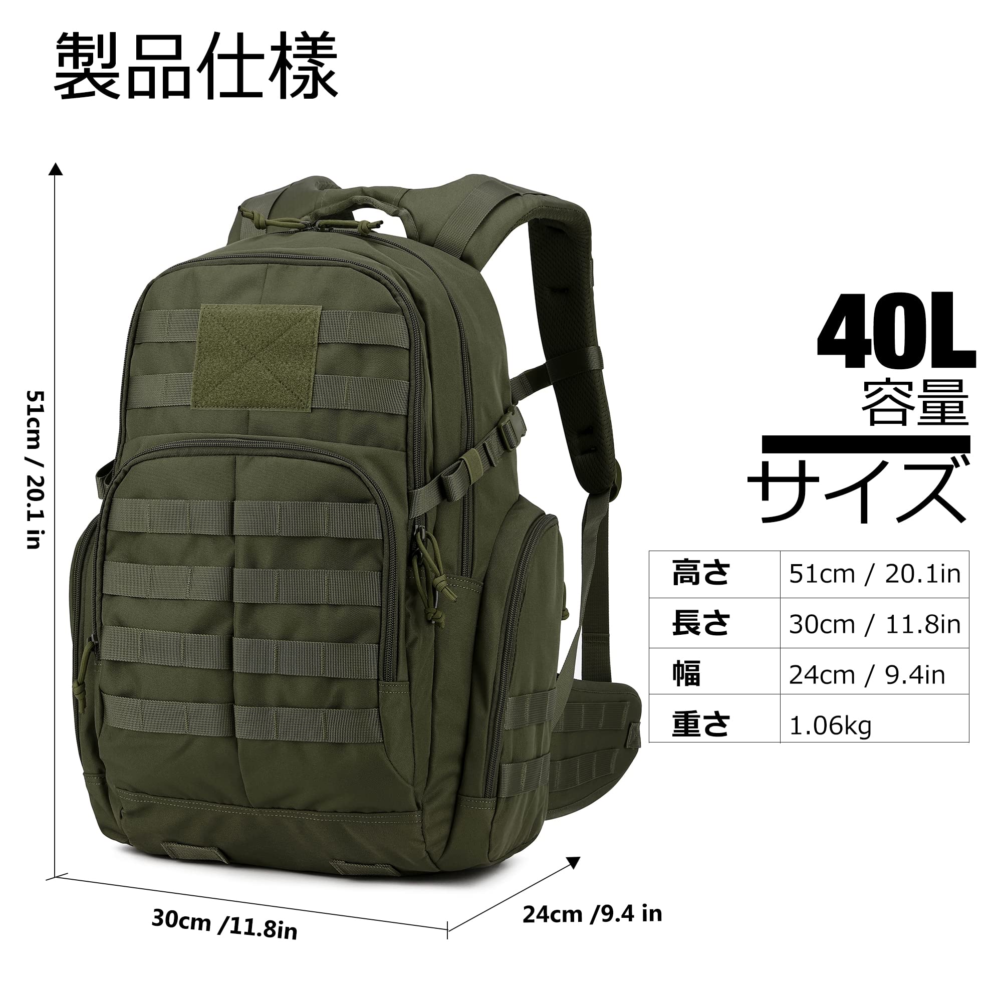 【リュック仕様】容量:40L。長39x高51x幅24cm。このミリタリーバックパックは600D耐水性ポリエステルで作られています。 YKKジッパー。