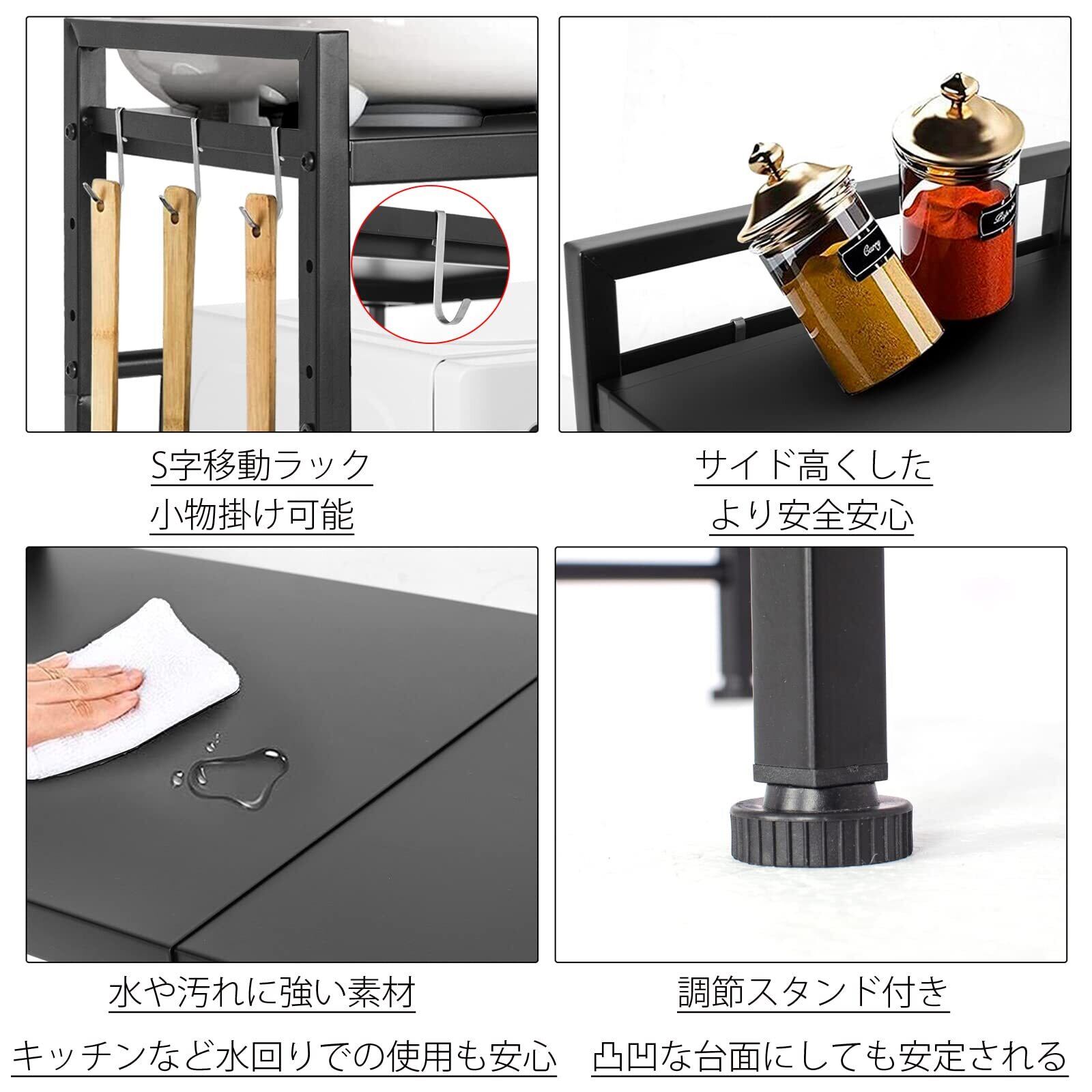 ಇ【荷重能力強い】耐荷重能力が強い、最小幅40cmの場合、耐荷重は約70kg、最大幅60cmの場合、約20kgです。安定で長持ちですキッチン収納棚です。また3つのフックが付き、スプーン等はそばに掛けて、上に色々な調味料、キッチン電器が収納できます、収納力が大幅に向上された。