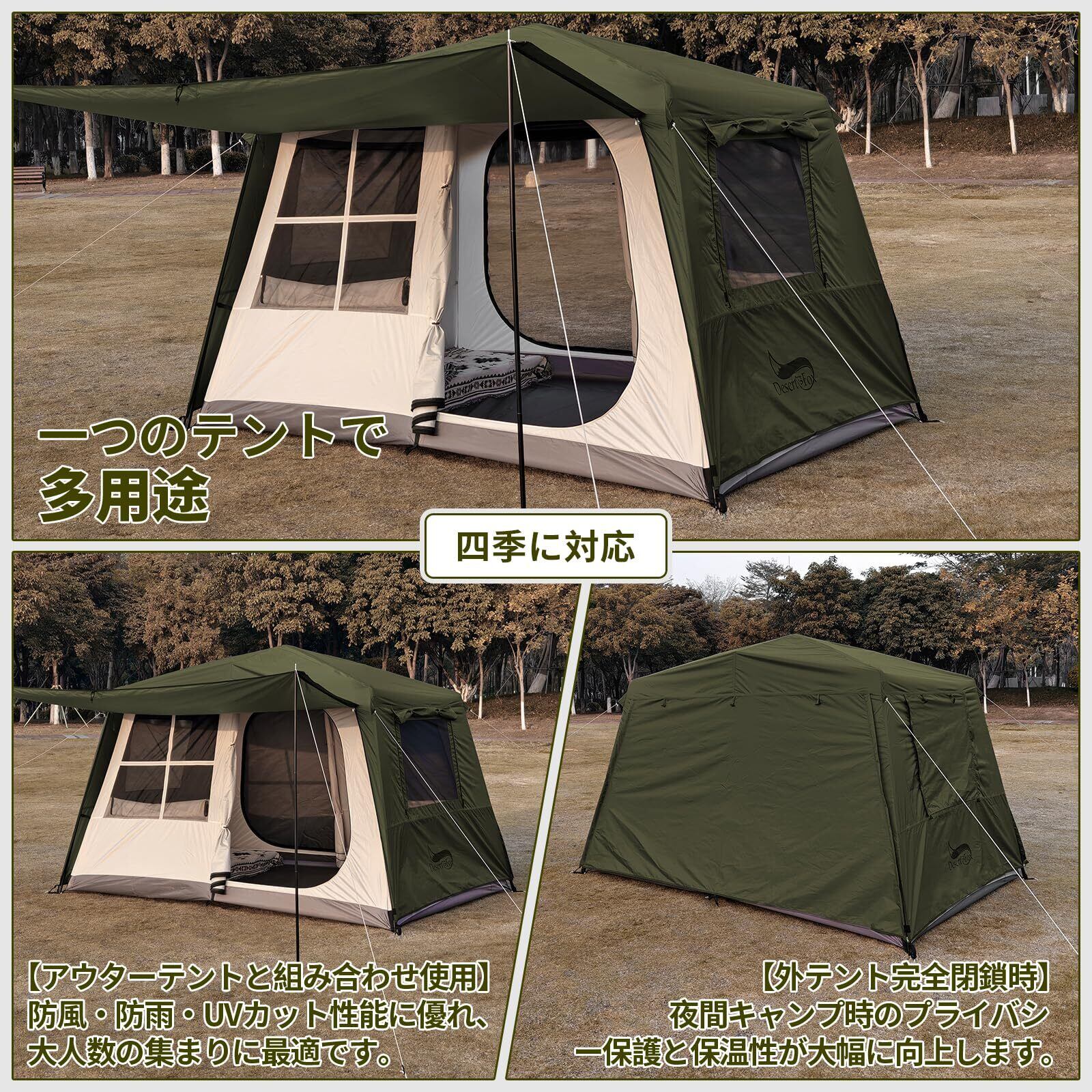 DesertFox テント大型 2~6人用 簡単設営 ロッジ型 高さ185cm/200cm 4000mm耐水圧 前後室あり キャンプテント 自立式 パークテント 二重層構造 4シーズン 初心者向け UVカット 通気防風防雨 キャンピング アウトドア お花見 おしゃれ 防災 前室ポール二本/収納袋付き JTZ