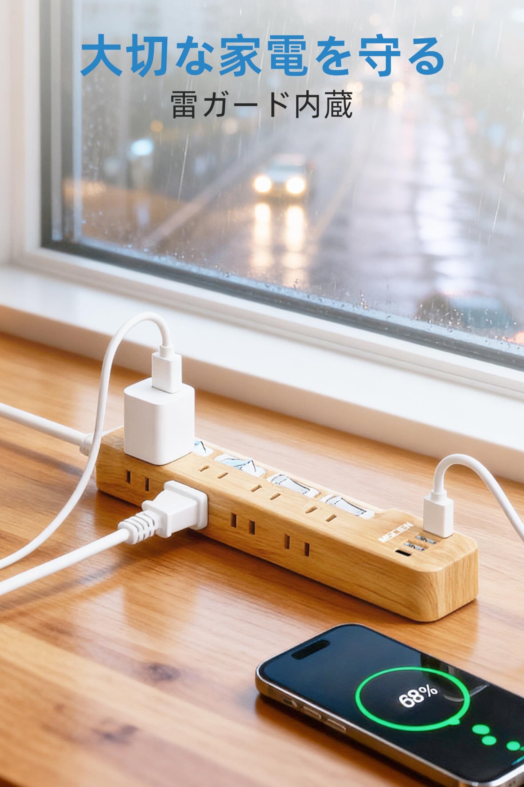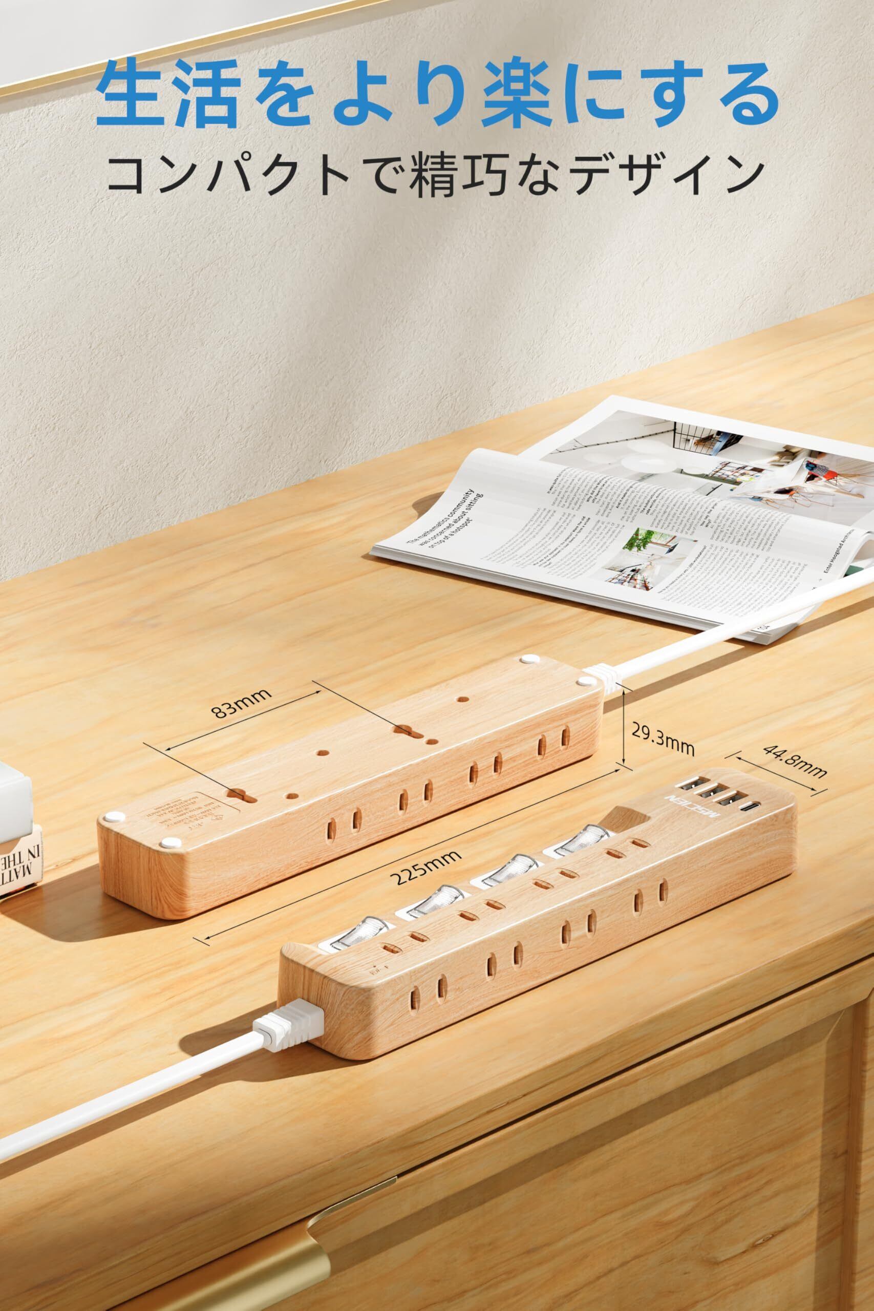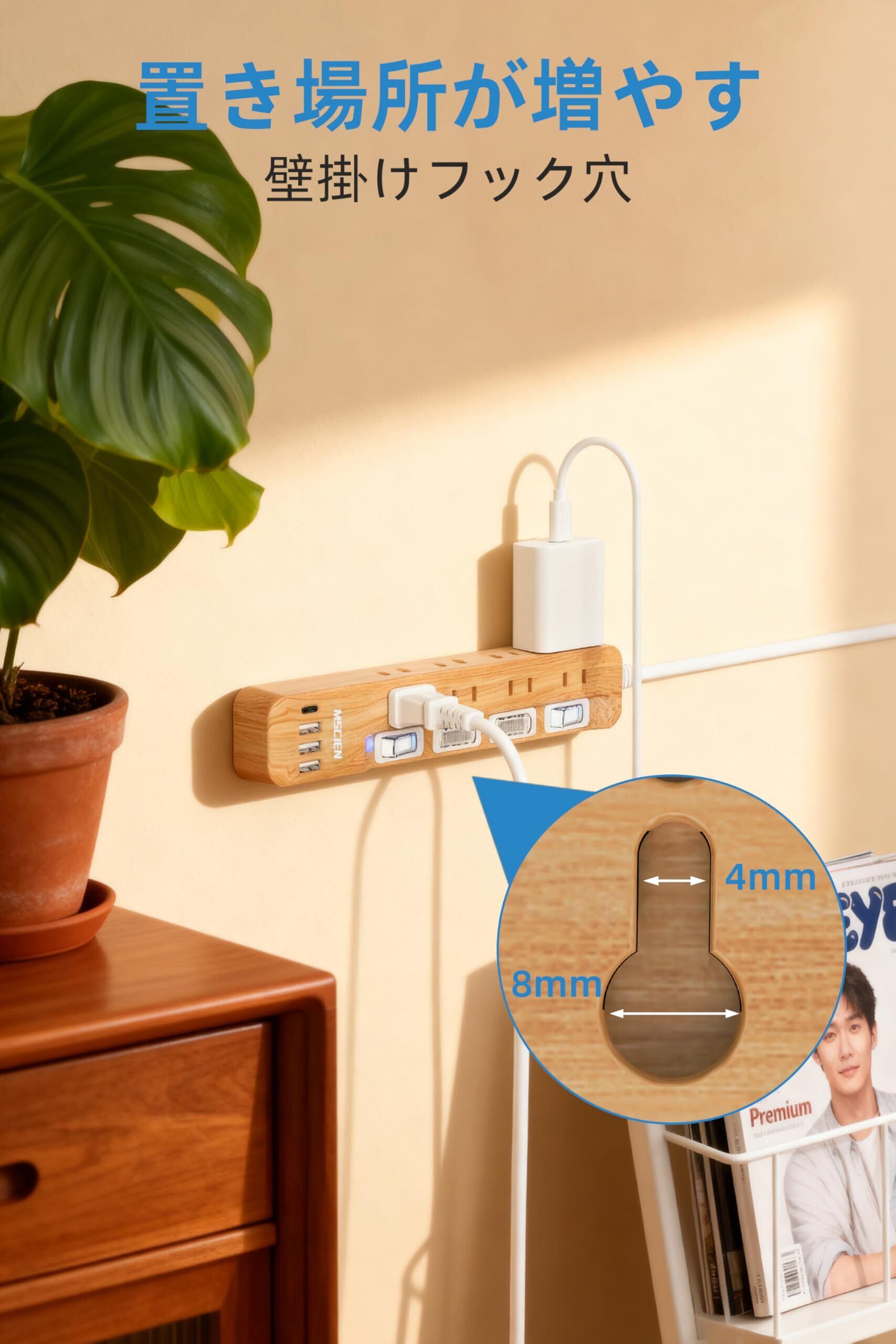 Mscienエムサイン 延長コード 2m 電源タップ usb付き 雷ガード 8AC口 3usb-a 1usb-c マルチタップ スイッチ たこあしコンセント 分岐 oa テーブルタップ スイングプラグ 壁掛け 木目調 蛸足コンセント