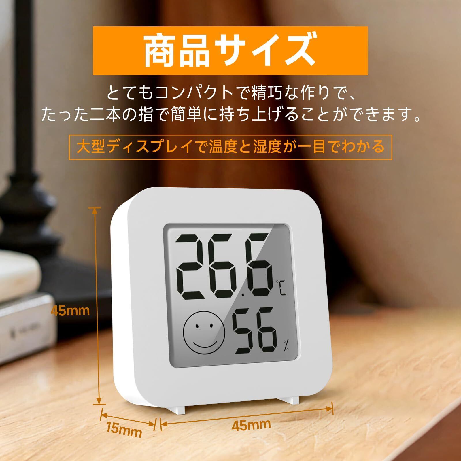 【コンパクトで収納しやすい】:サイズわずか45mm(高さ)×45mm(幅)×15mm(厚さ)。設置場所を選ばないミニサイズの温湿度計(狭いスペースにも簡単に設置可能)。工具不要、配線不要、設定不要の「貼るだけで使える」シンプルな設計。