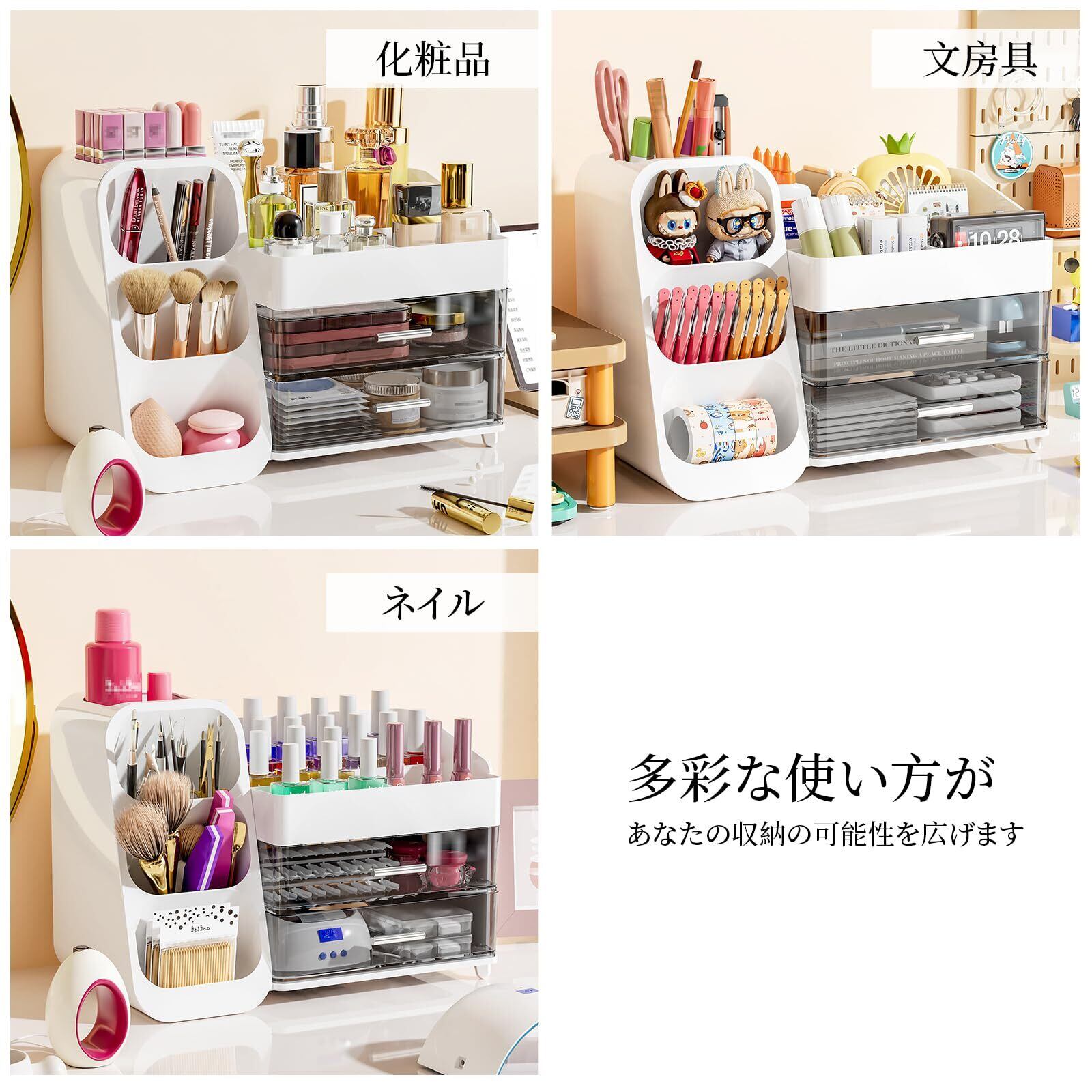 【マルチユース収納ボックス】化粧品はもちろん、スキンケア用品、文房具、ネイル道具、デスク周りの雑貨など、多種多様な小物をすっきり整理。リビング、寝室、子ども部屋、オフィスなど、シーンを選ばずご利用いただけます。散らかりがちな小物を一つにまとめて、快適な空間作りをお手伝いします