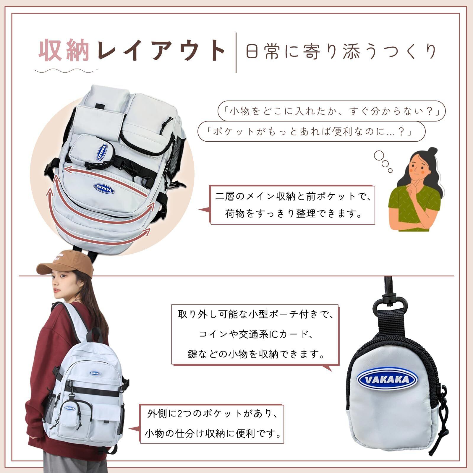 【3層式の大容量構造&独立ポーチ付き】サイズ:43x30x15cm/0.55kg収納スペースはたくさんあるのでとても便利です。メインルームは14インチまでのノートパソコンを収納できます。サブポケットが大きくて仕切りもついて、A4サイズの書類などが余裕に入れます。フロントにはたくさんの小さなポケットが付いており、小物をスッキリと整理整頓しながら収納スペースを確保できます。リュックの前には取り外し可能なポケットがついて、小銭、バスカード、鍵などの小物を入れることができます。