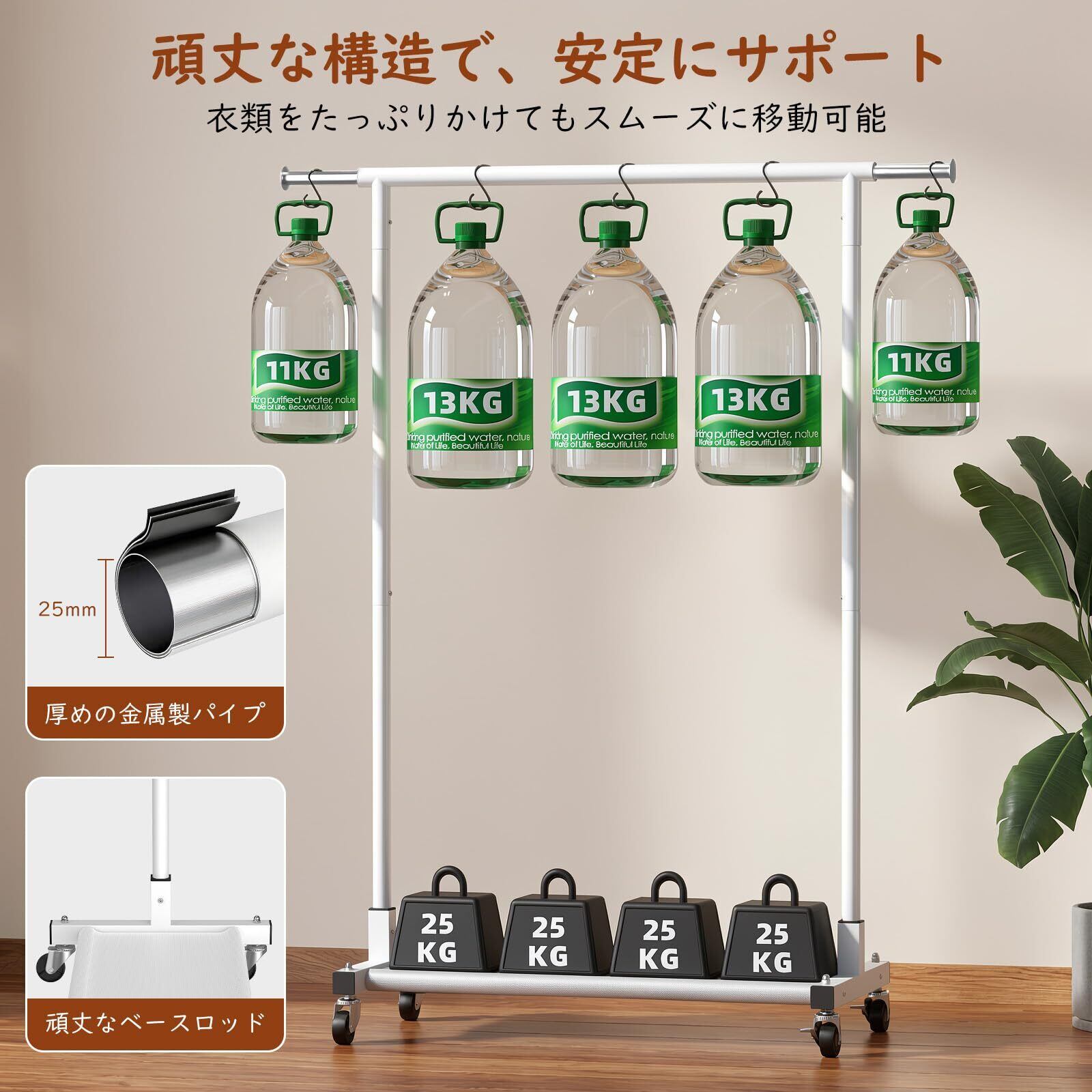 「頑丈なスチール製で長く安心使用」 当ハンガーラックは、厚みのある高品質スチールパイプを採用し、しっかりとした強度を実現。ラック全体の耐荷重は約160kgと、冬の重いコートや大量の衣類、バッグ類などもたわまずしっかりと支えます。接続部分には補強設計を施し、揺れや歪みを抑え、安定性を確保。表面にはサビに強い亜鉛メッキを施しているため、湿気の多い場所でも耐久性を発揮します。