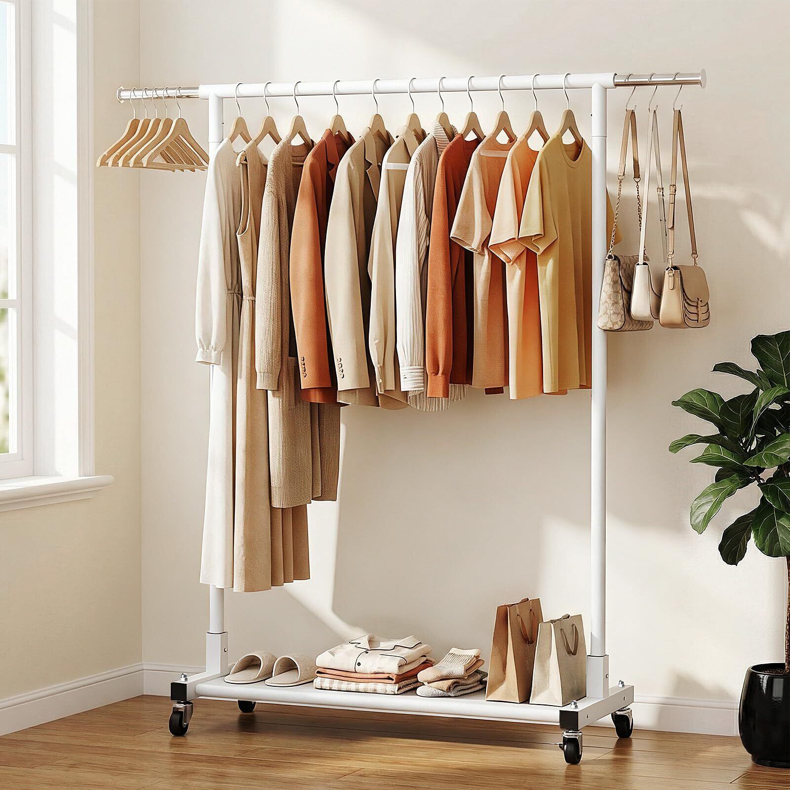 ハンガーラック 大容量 耐荷重約160KG キャスター付き 幅90cm-140cm シングルタイプ Luxspire 幅伸縮可能 金属製 頑丈 洋服ラック 丈長の服収納向き スチールラック ハンガー 下棚付き 洋服掛け おしゃれ 衣類収納 収納力あり スッキリ収納 組立簡単 日本語取扱説明書付き ホワイト