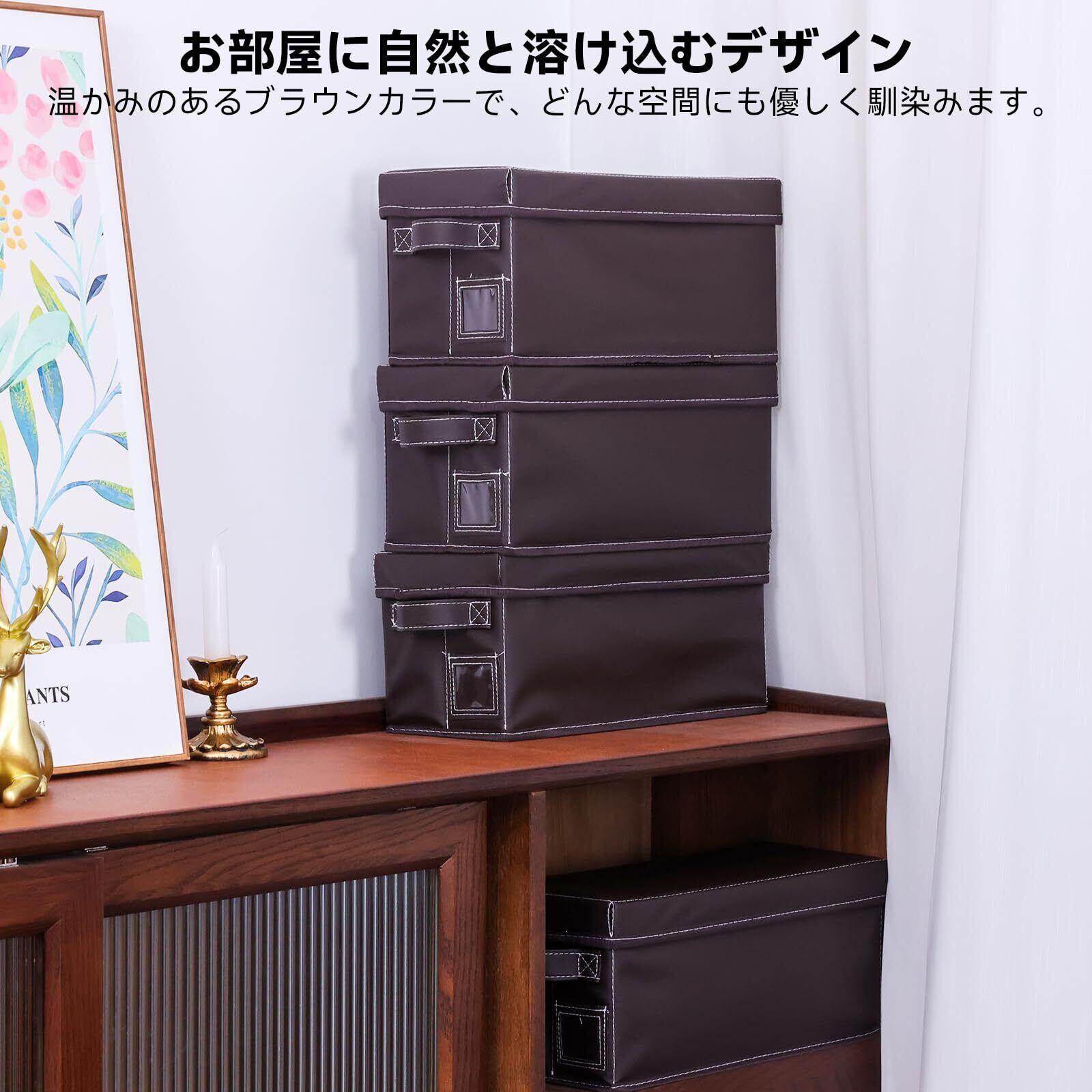 【高品質フェイクレザー素材 & 上品な仕上げ】 表面にブラウンの合皮を採用し、手触り良く上質な見た目。汚れが付きにくく、拭き取りも簡単。