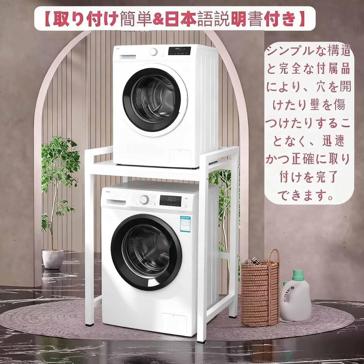 【取り付けが簡単】このバスルーム収納ラックはシンプルな構造で、洗濯機や乾燥機に簡単に組み立てることができます。日本語説明書付きのため組み立てが簡単。