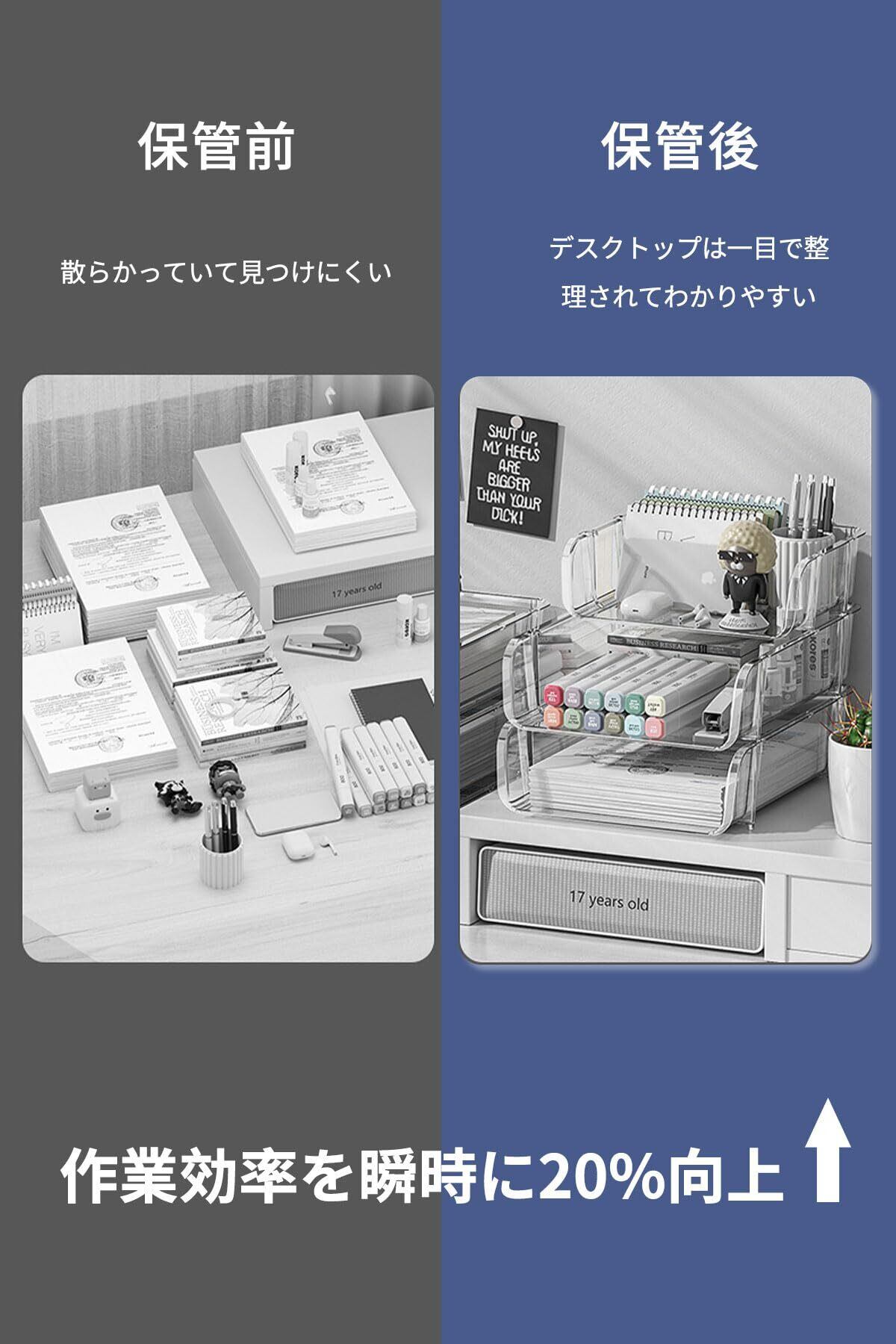 【絶妙なデザイン】:A4収納ボックスは大きな開口部で設計されており、持ち運びに便利で、物が置きやすくなり、手を伸ばす手間が省けるので、作業効率が向上させます。多機能・多場合に適用:卓上収納トレーには文房具、書類、本、タオル、衣類、シャンプーなど様々なタイプのものが収納できます。そのため、寝室、リビング、浴室など家の中のいろいろな部屋に置いてもいいし、オフィスで使ってもいいです。お客様のニーズに合わせてお選びいただけます。
