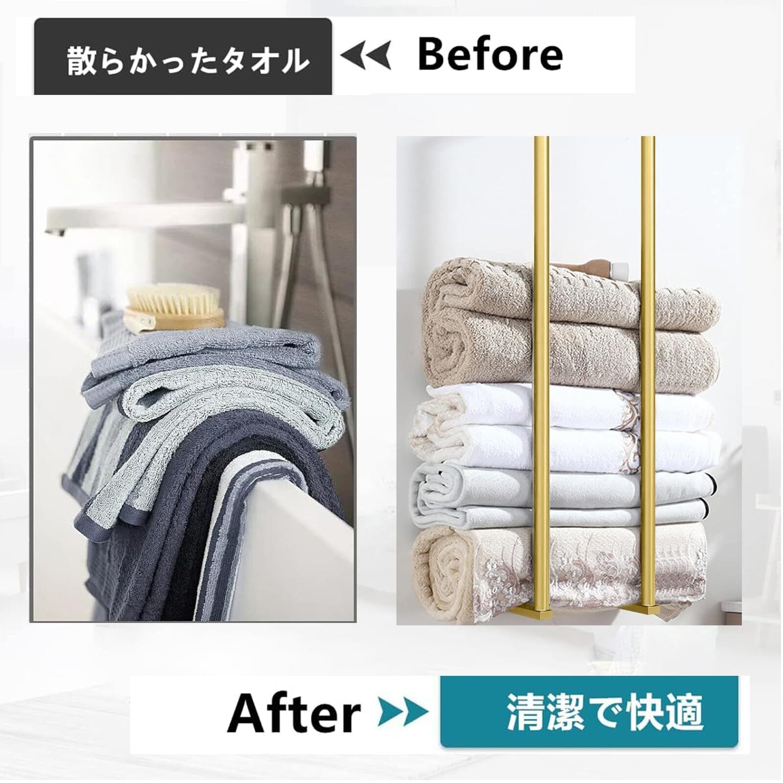 タオルラック 壁取り付け タオルハンガー タオル掛け バスルームタオル収納 バスタオルスタンド おしゃれ 丸めて収納ランドリーラック バスタオル置き タオル収納 タオルホルダー 取り付け簡単 省スペース コンパクト シンプル (ゴールド)
