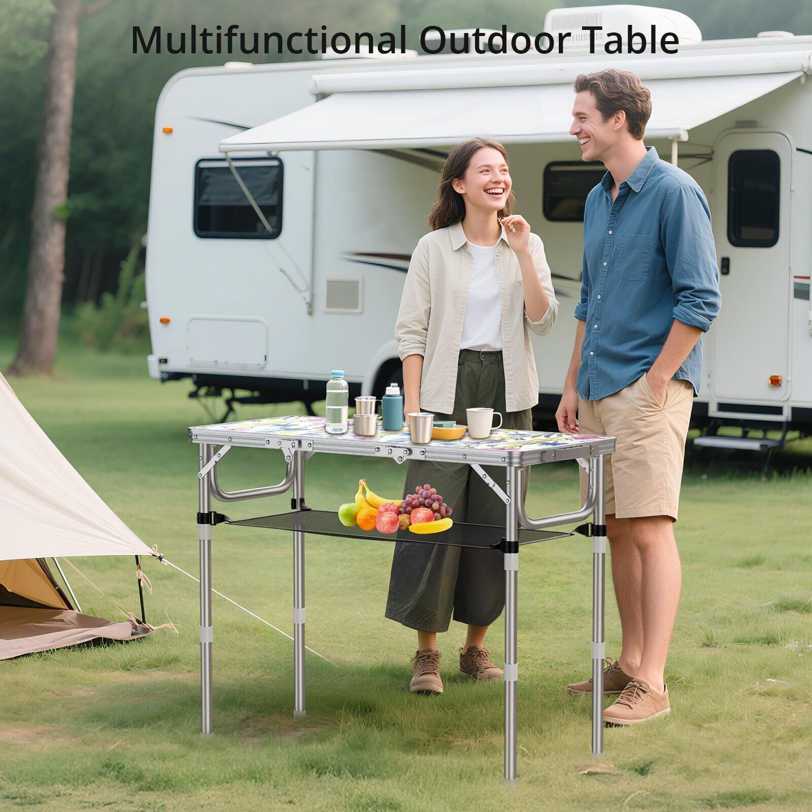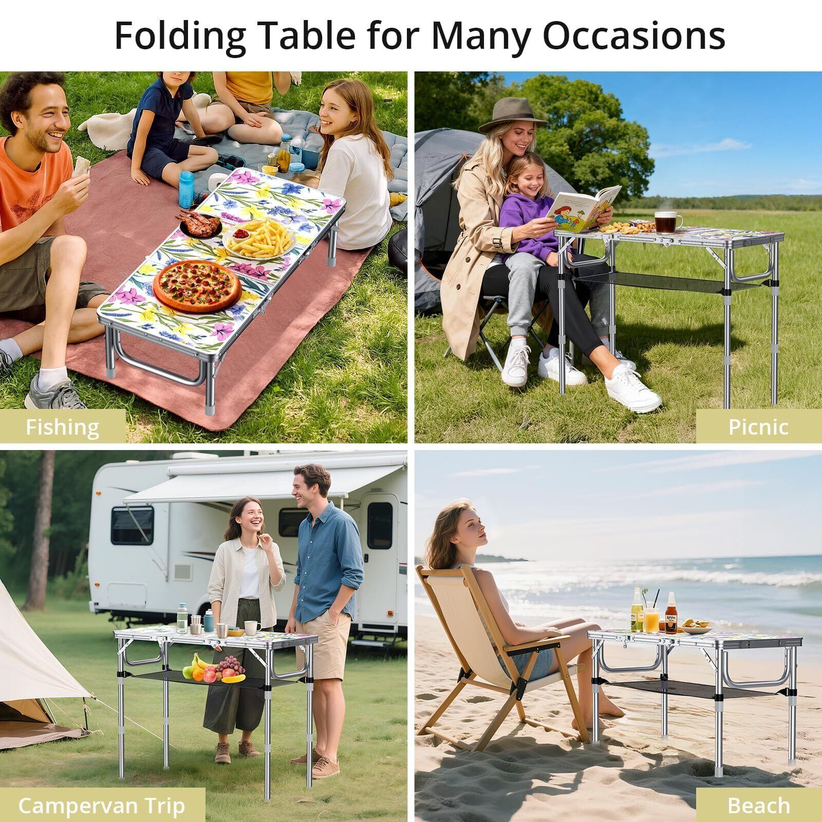 Anbte アウトドア 折りたたみテーブル 高さ調整 3段階 最大70cm コンパクト テーブル バーベキュー キャンプ ピクニック用 軽量 収納ネット付き RV用 アルミ製 キャンプ用品 花柄デザイン
