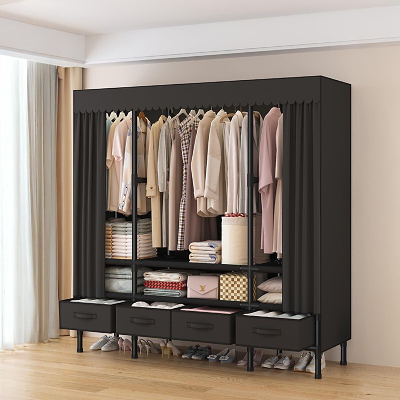 ワードローブ カバー付き クローゼット ファンシーケース 頑丈 大容量 組み立てが簡単 引き出し付き ファッション 衣柜 防水 防塵 防汚 耐用 衣類収納ラック 多層ストレージ 色もサイズもいろいろ(黒A,長さ140CM)